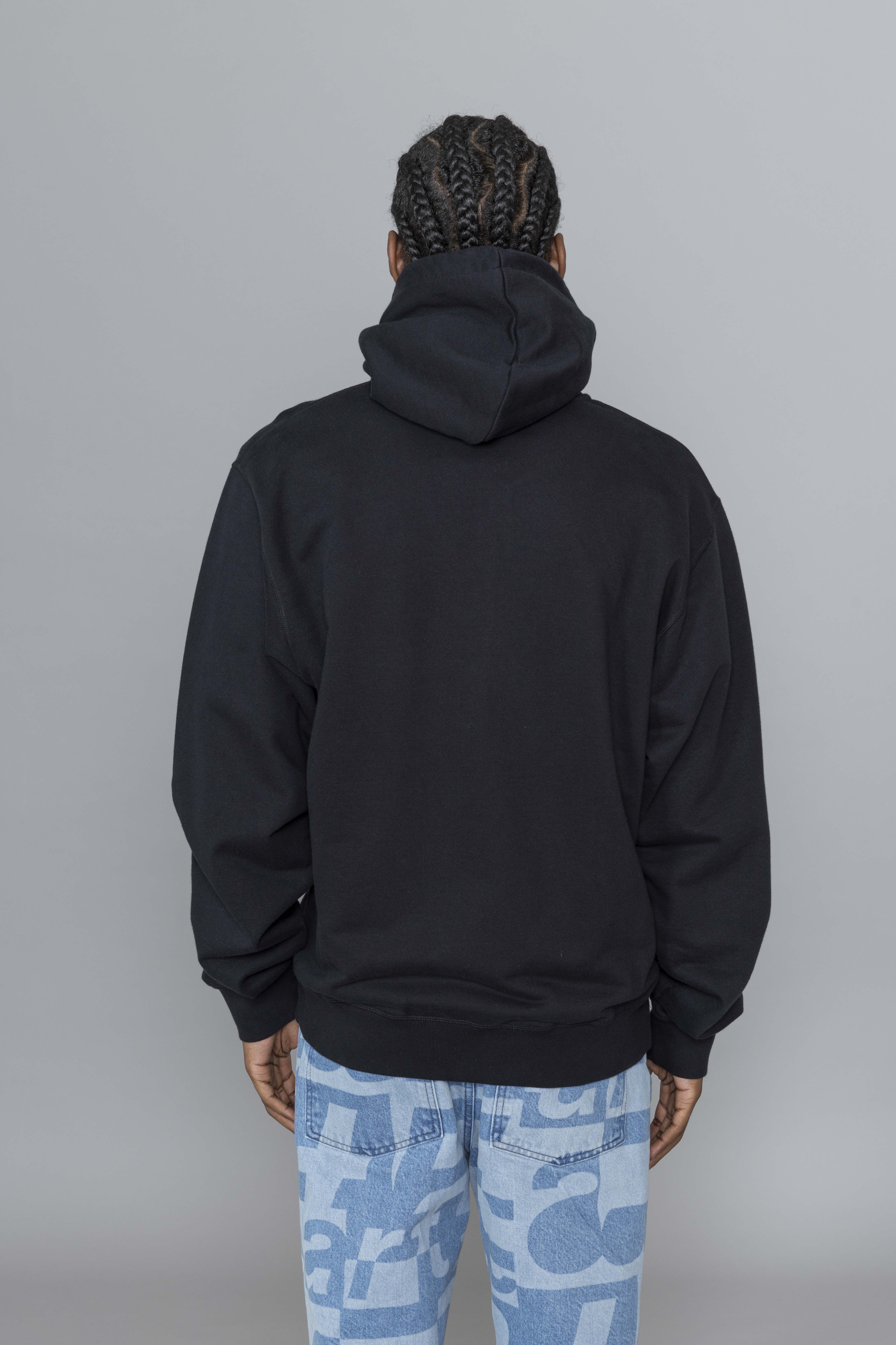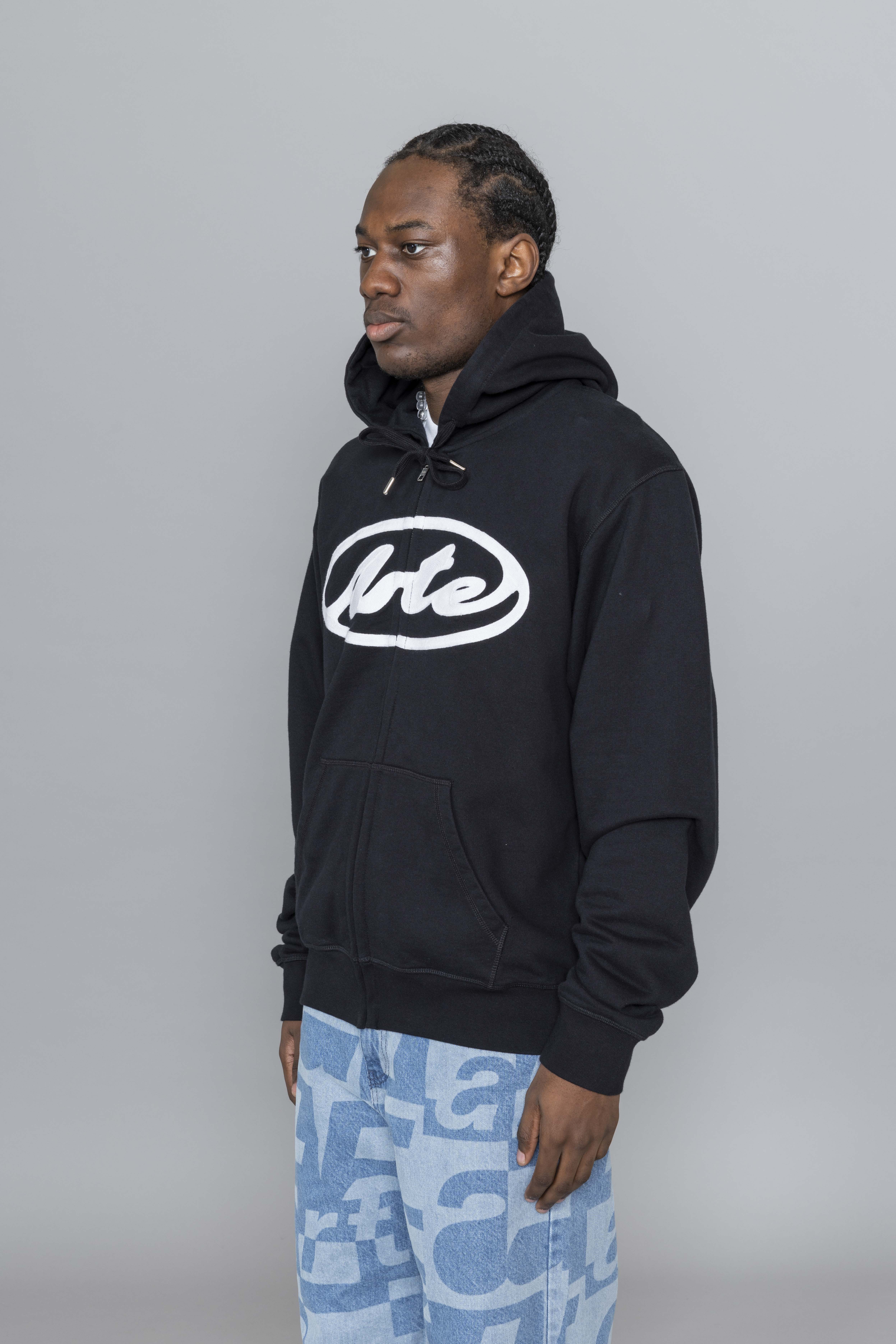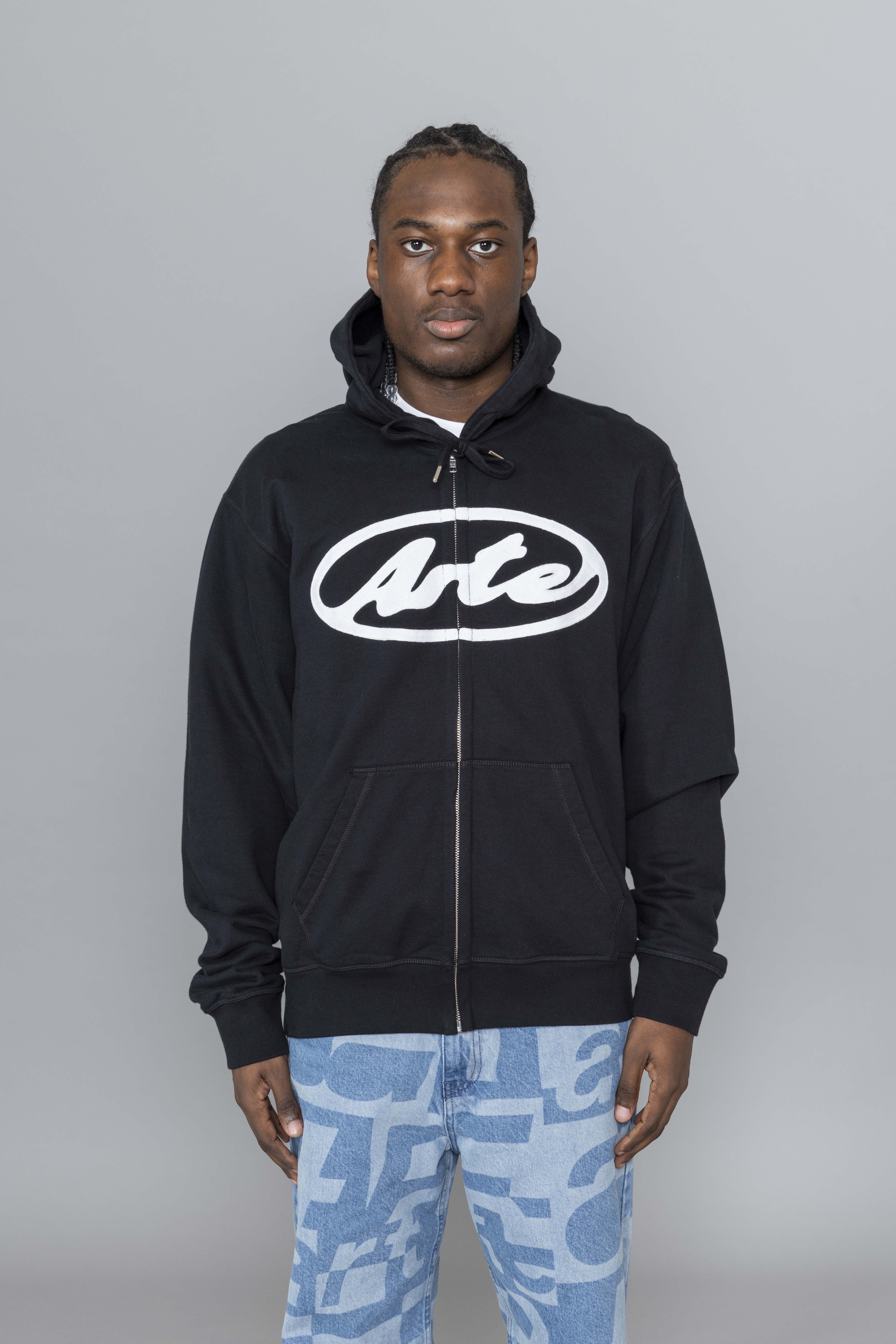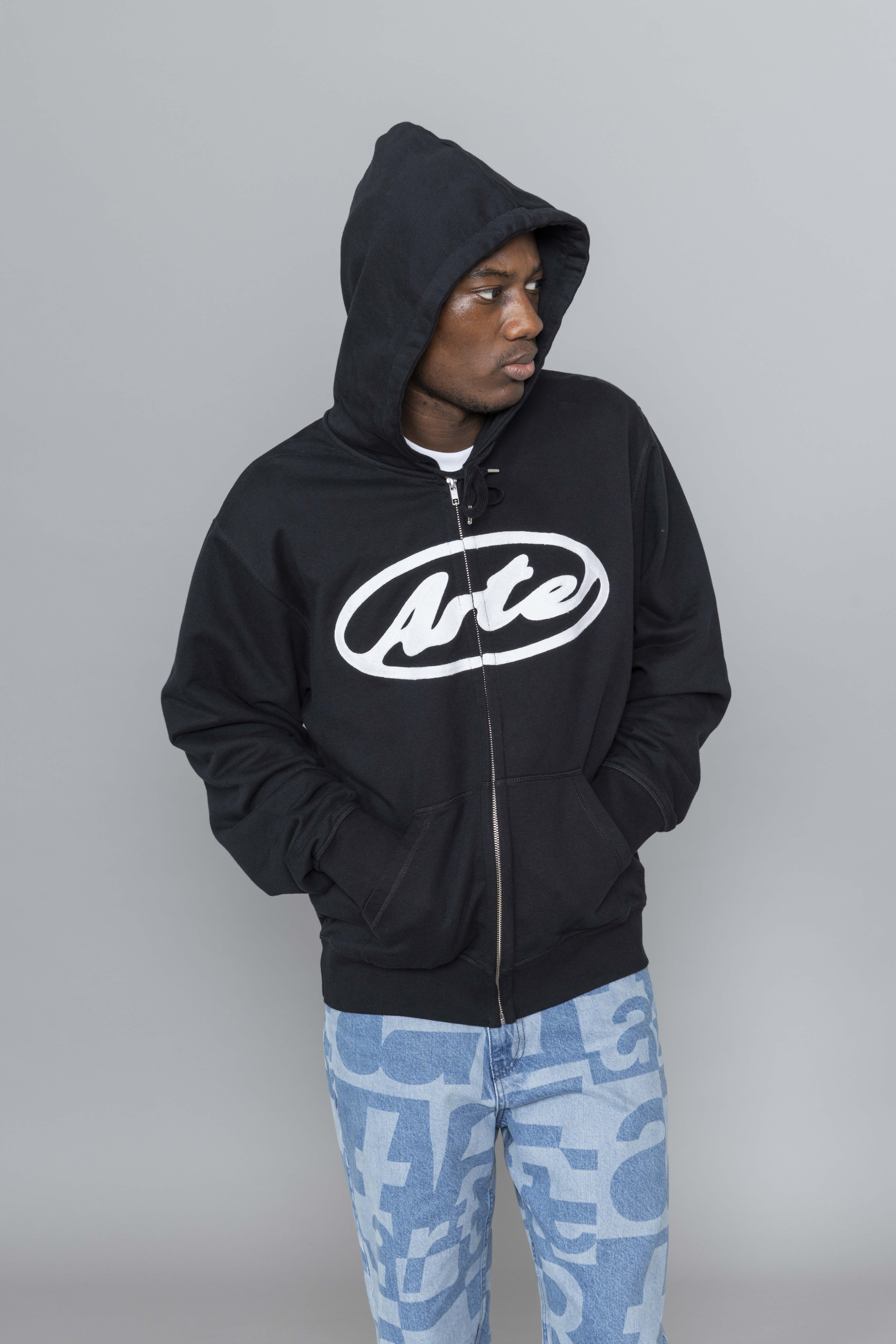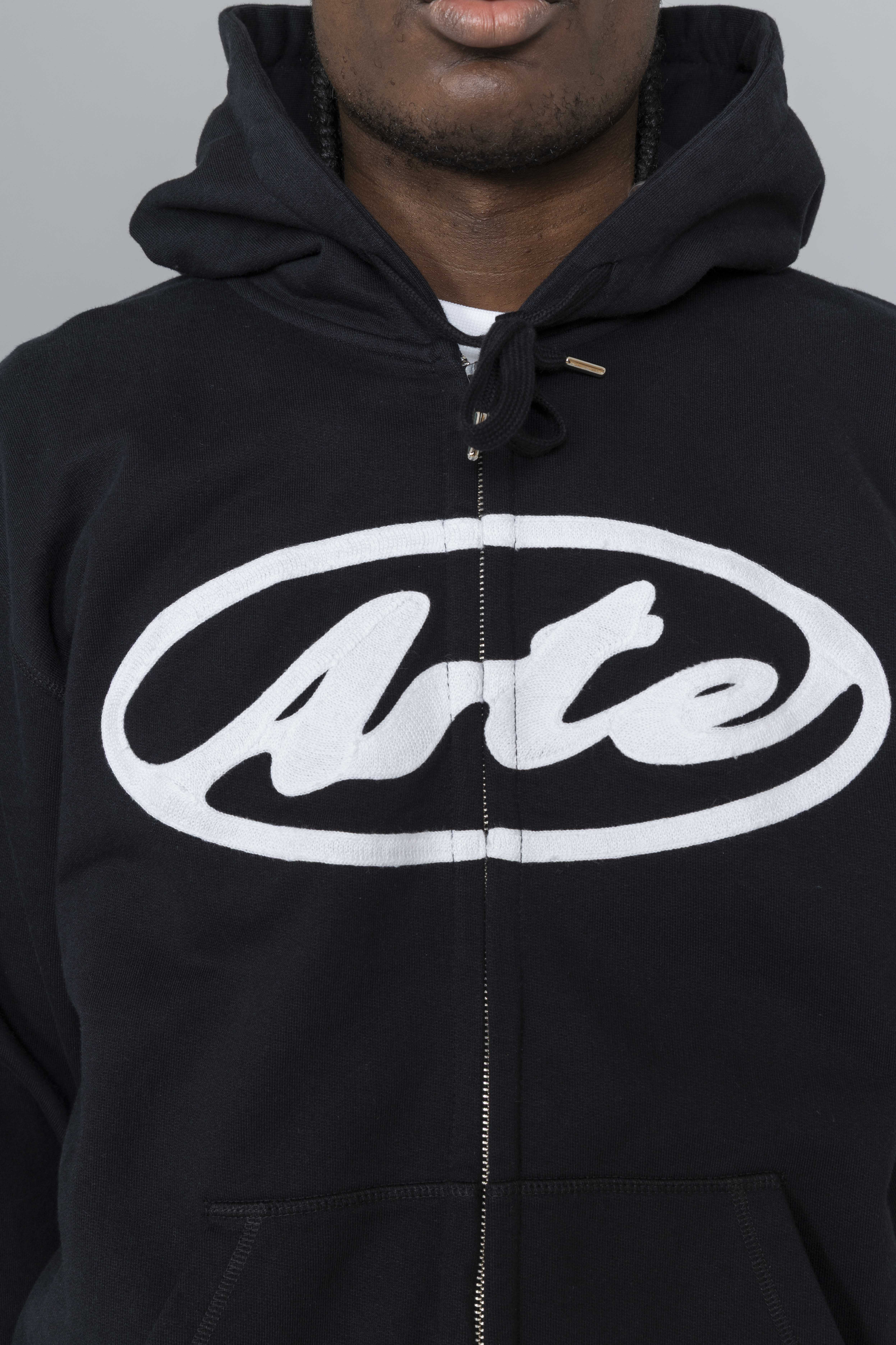Arte Antwerp Circle Logo Zip Hoodie Black. Crafted from premium heavyweight cotton, this zip hoodie delivers a clean, structured silhouette with everyday comfort. It features a full-length zipper, adjustable drawstring hood, and two side pockets for functional wear. The chest is finished with this season’s Circle Arte logo embroidered in white, creating a bold graphic contrast against the black base.