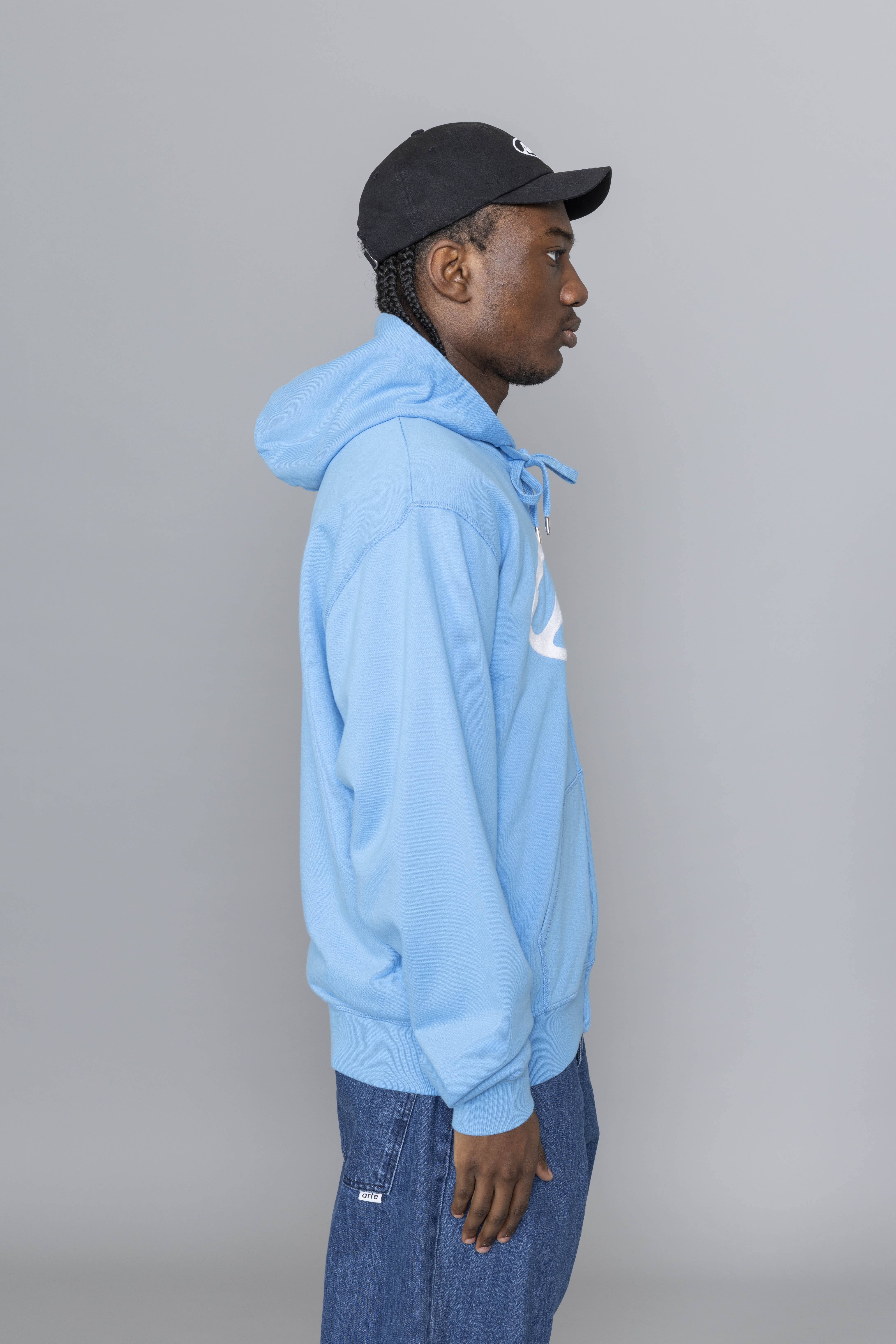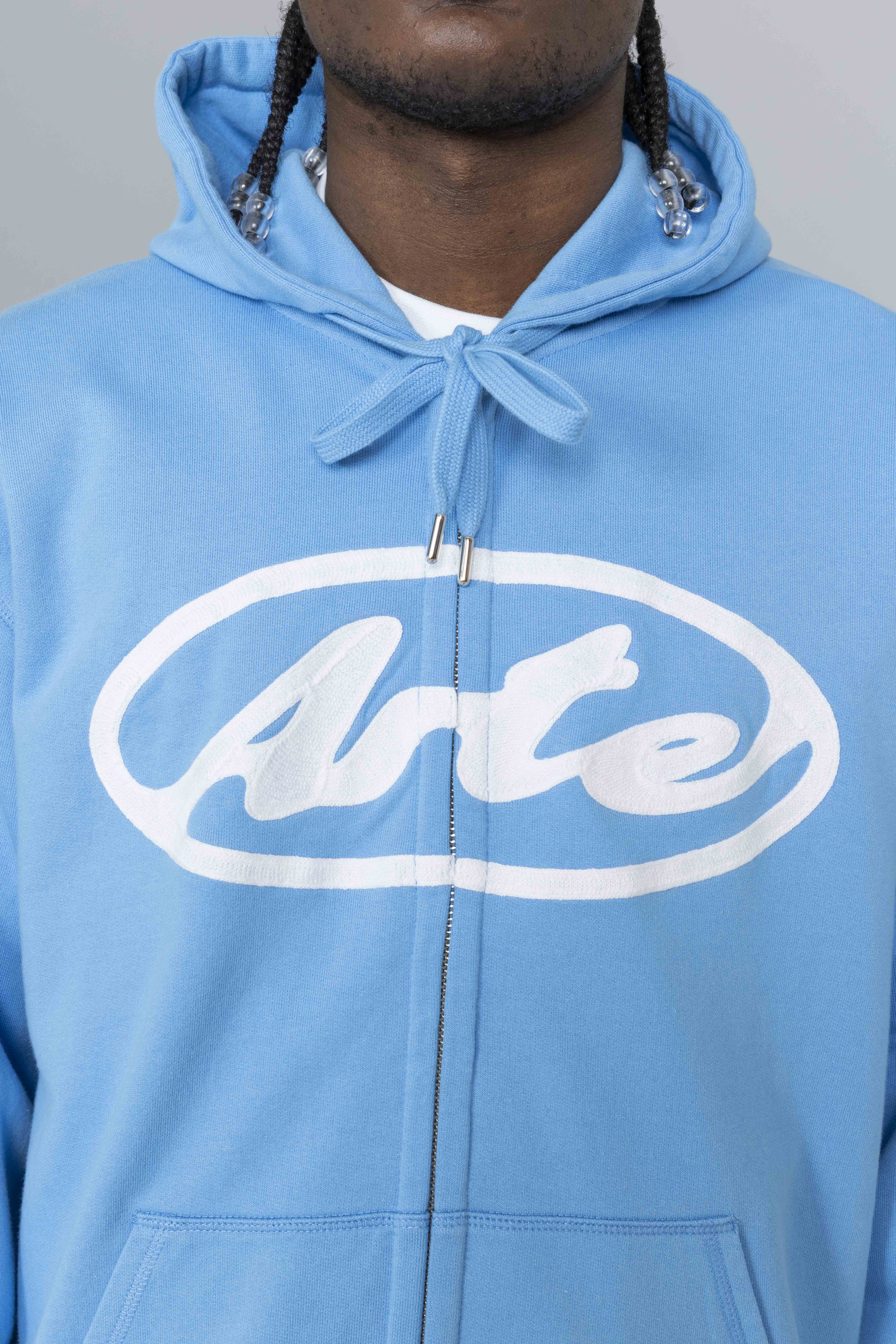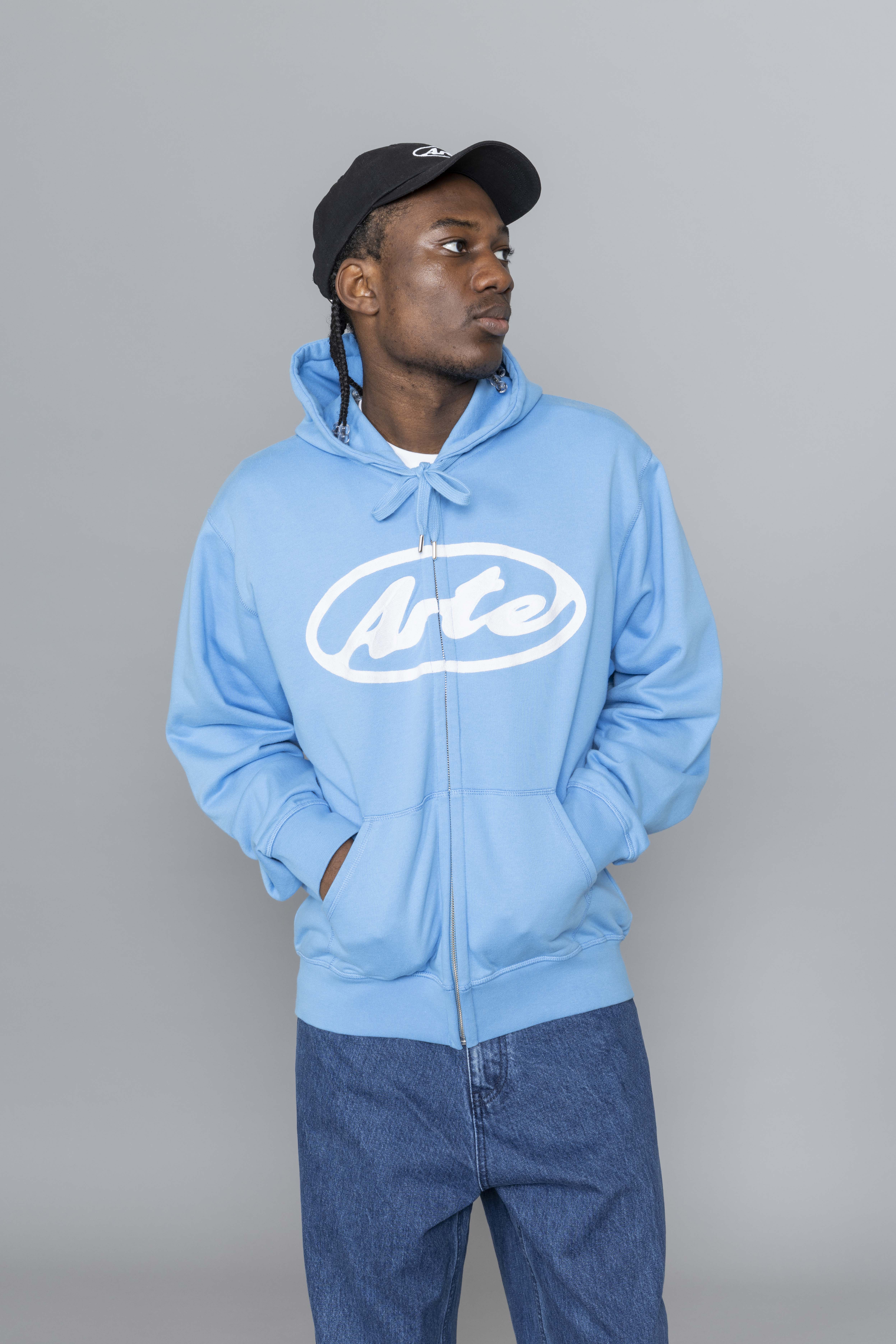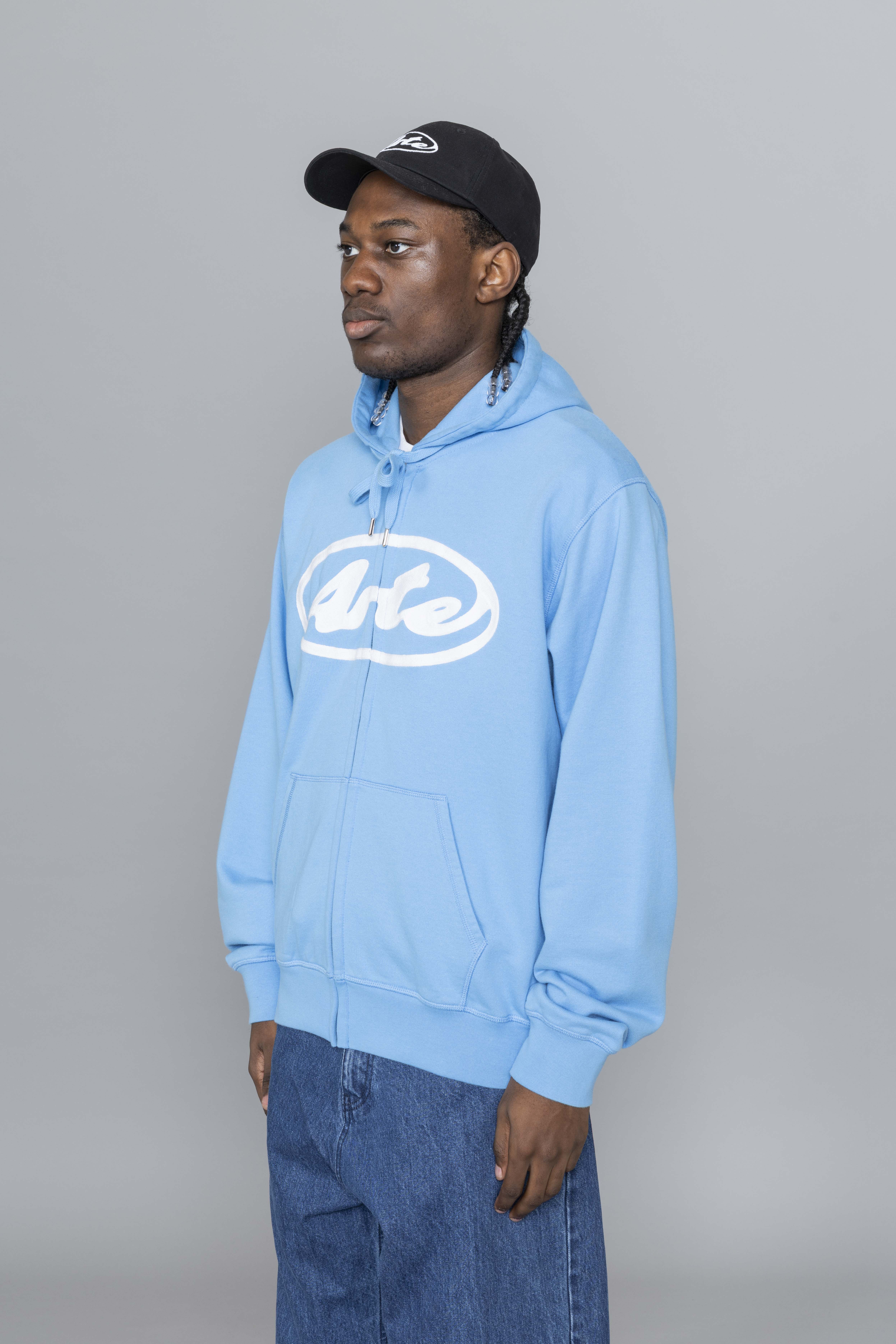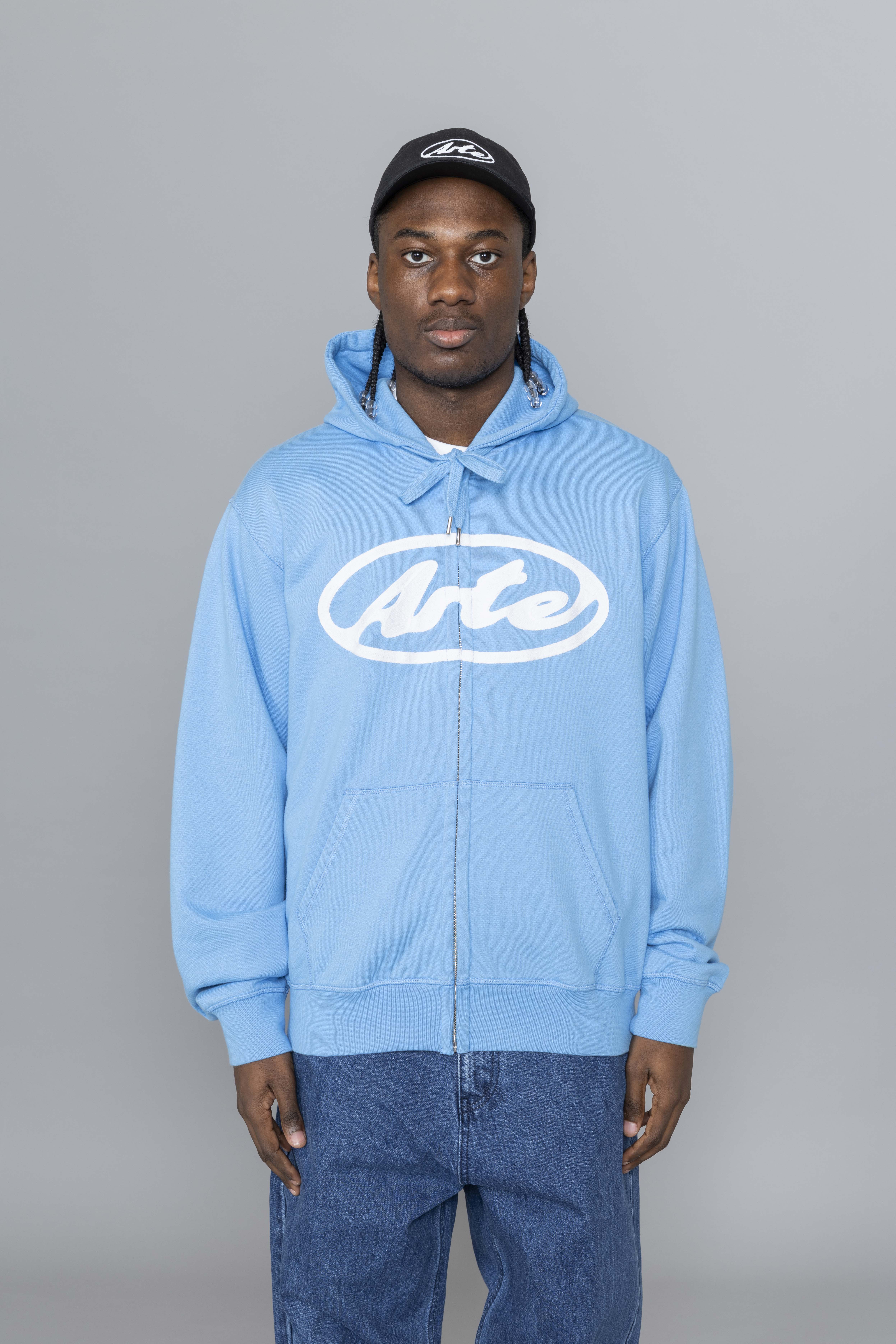 Arte Antwerp Circle Logo Zip Hoodie Blue. Crafted from premium heavyweight cotton, this zip hoodie delivers a clean, structured silhouette with everyday comfort. It features a full-length zipper, adjustable drawstring hood, and two side pockets for functional wear. The chest is finished with this season’s Circle Arte logo embroidered in white, creating a bold graphic contrast against the black base.