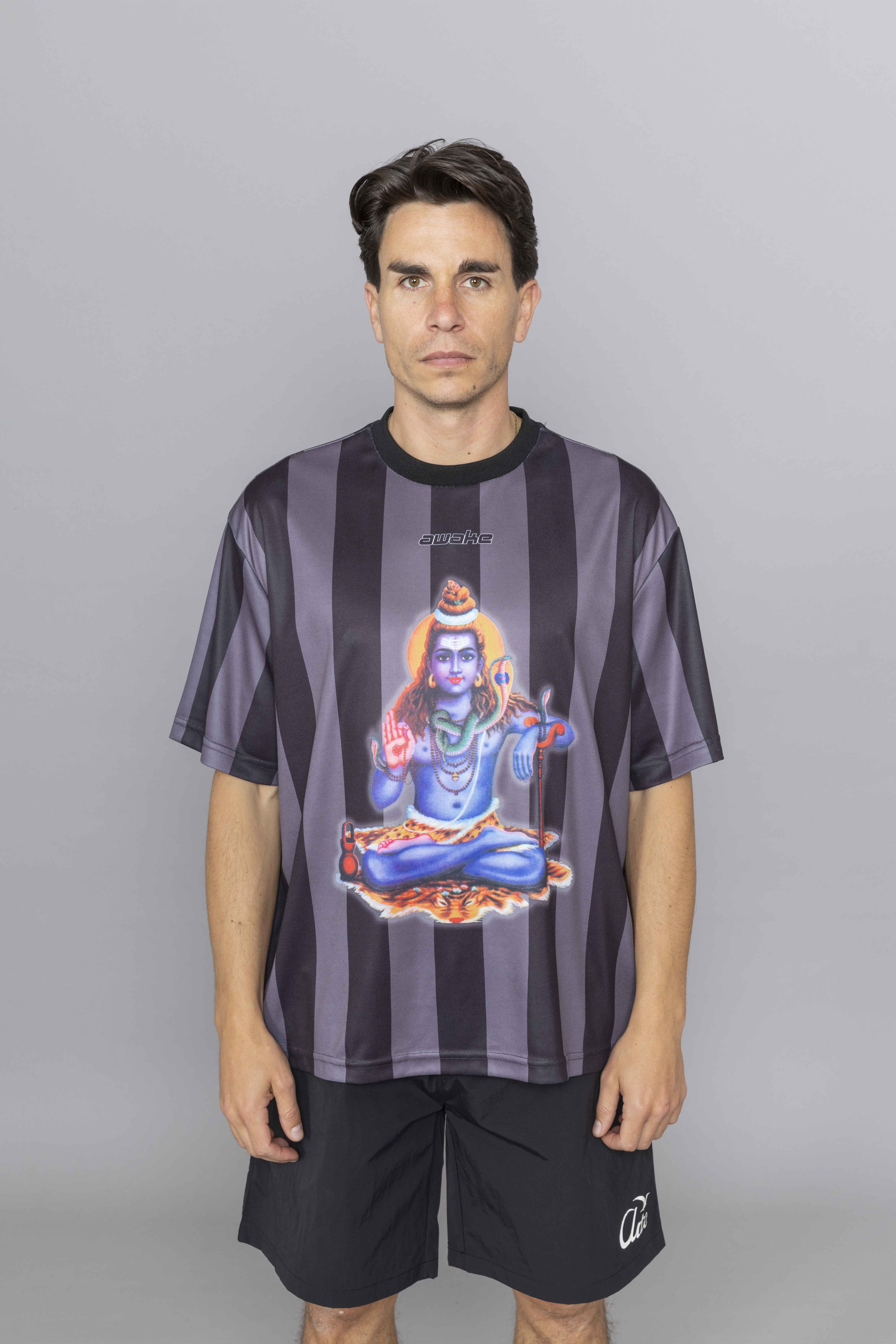 Polyester soccer jersey with printed logo and deity graphic.