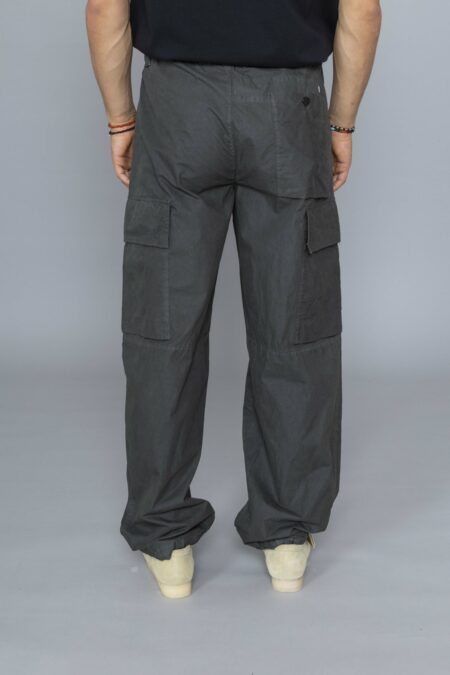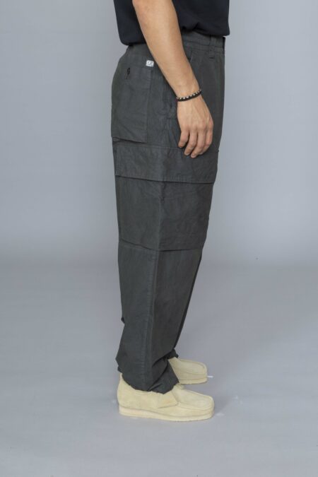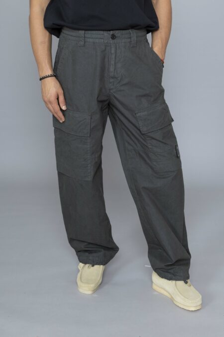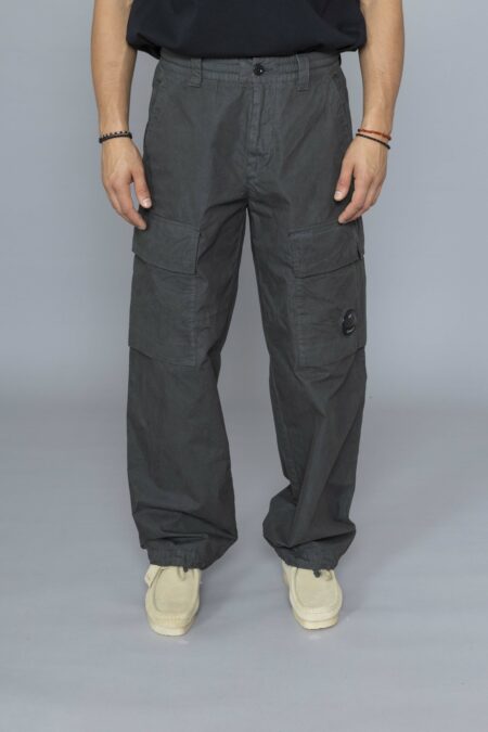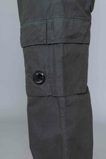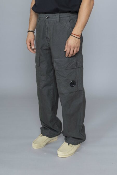 C.P. Company Micro Reps Peached Cargo Pants Dark Shadow. Cargo pants in cotton reps with double buffing through diamond or carbon cylinders on the face. Garment dyed for rich color and a soft feel. Designed with a button and zip fastening, belt loops, and adjustable drawstring hems. Features multiple pockets, including a thigh flap pocket with the signature C.P. Company Lens.