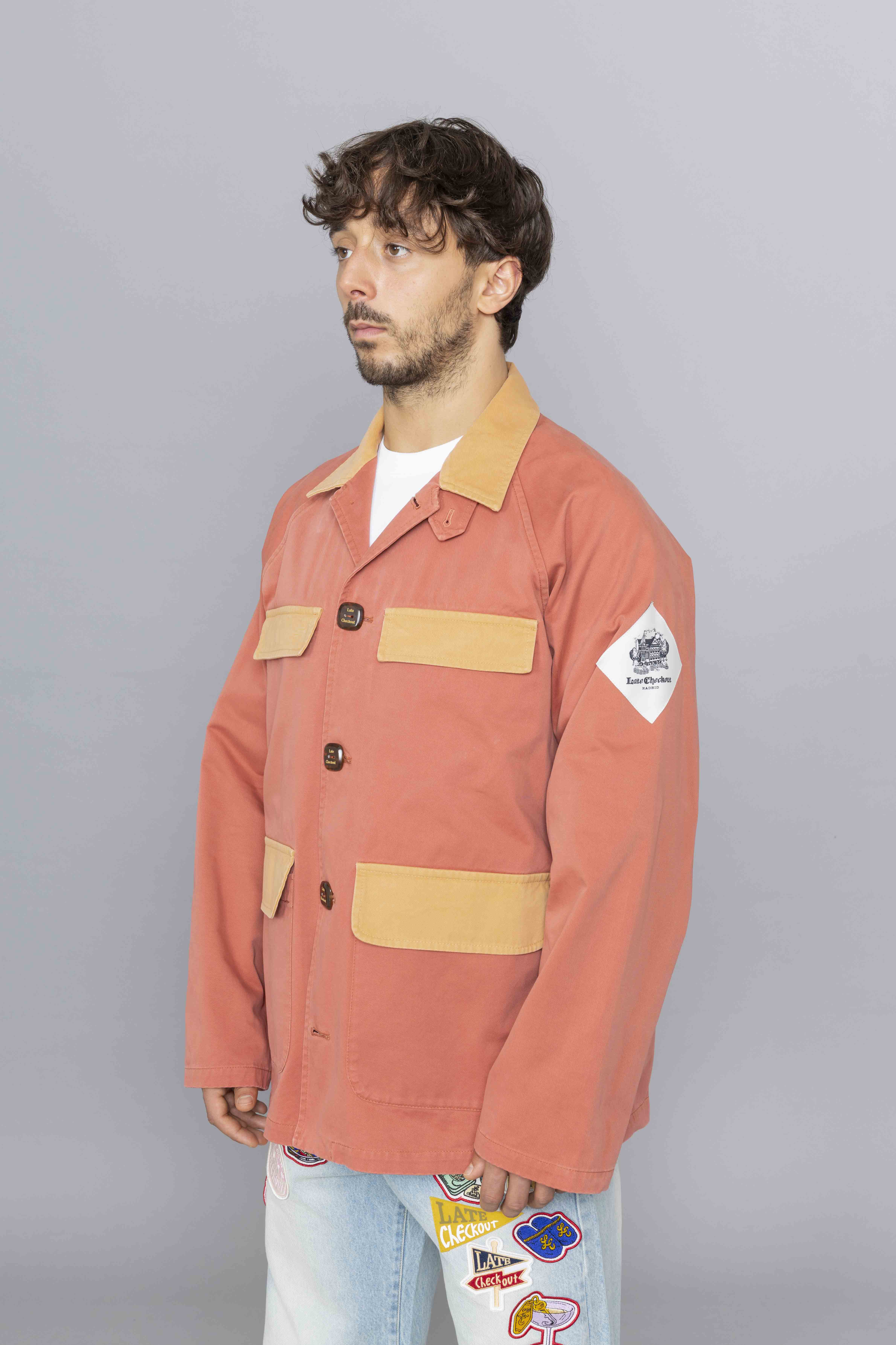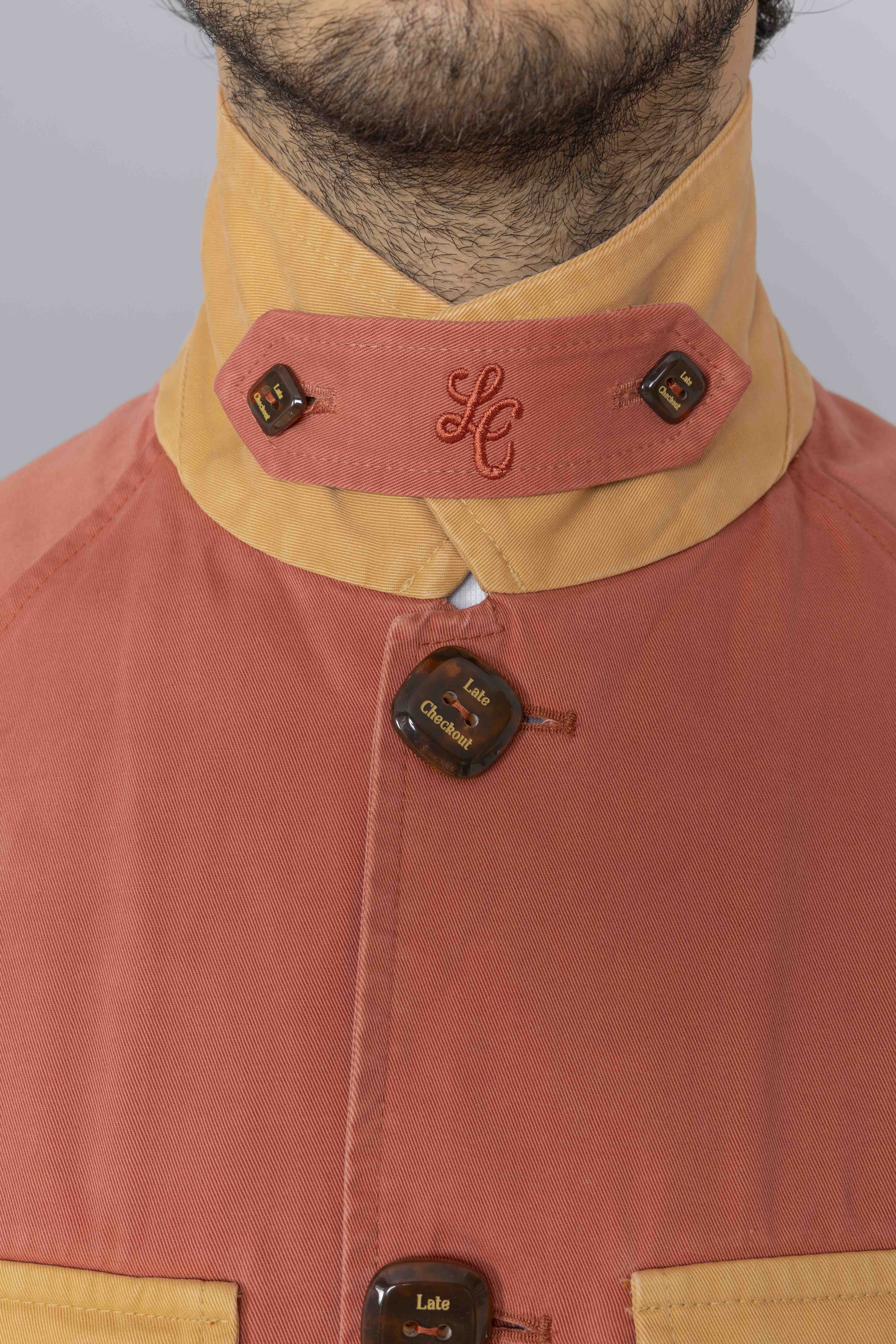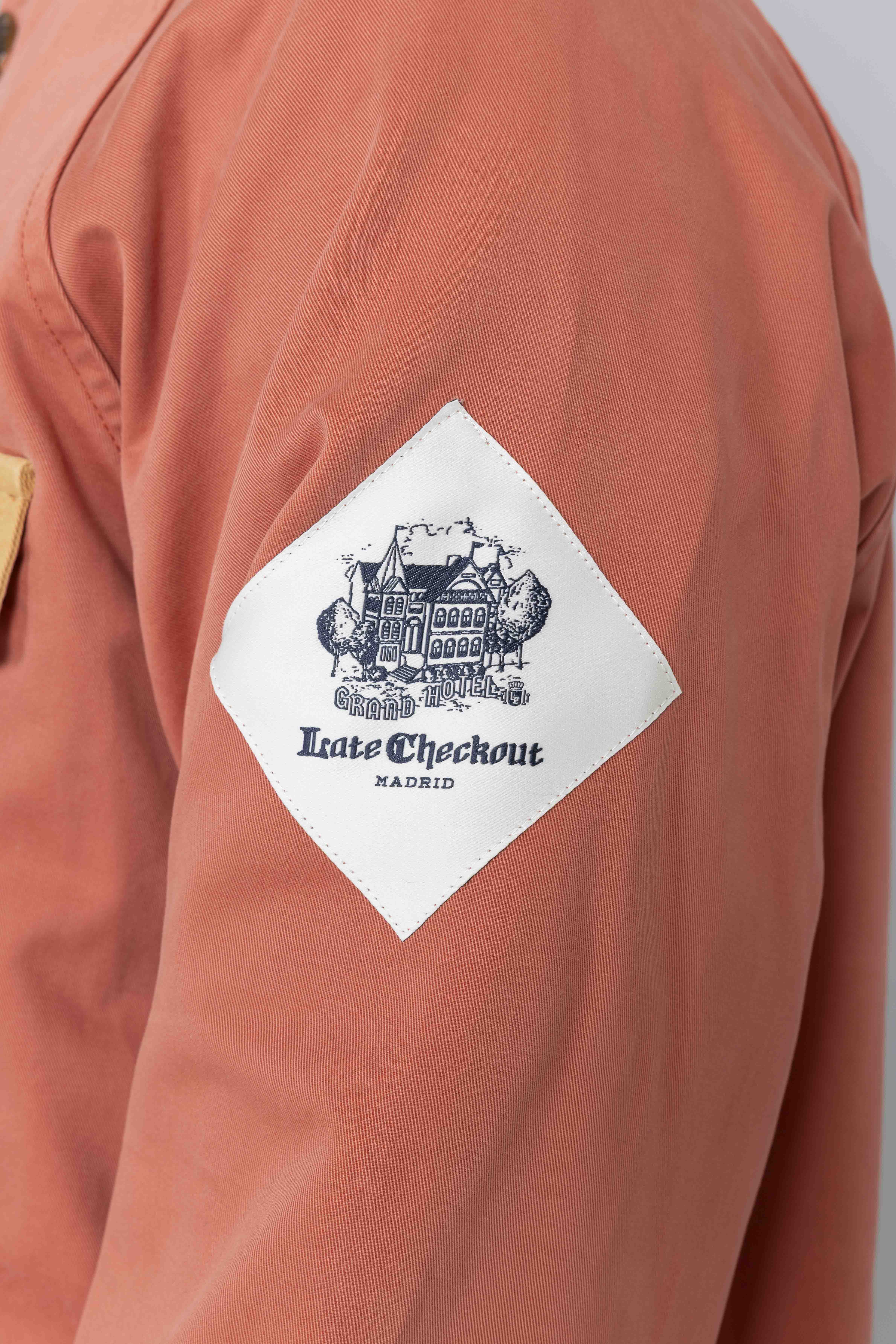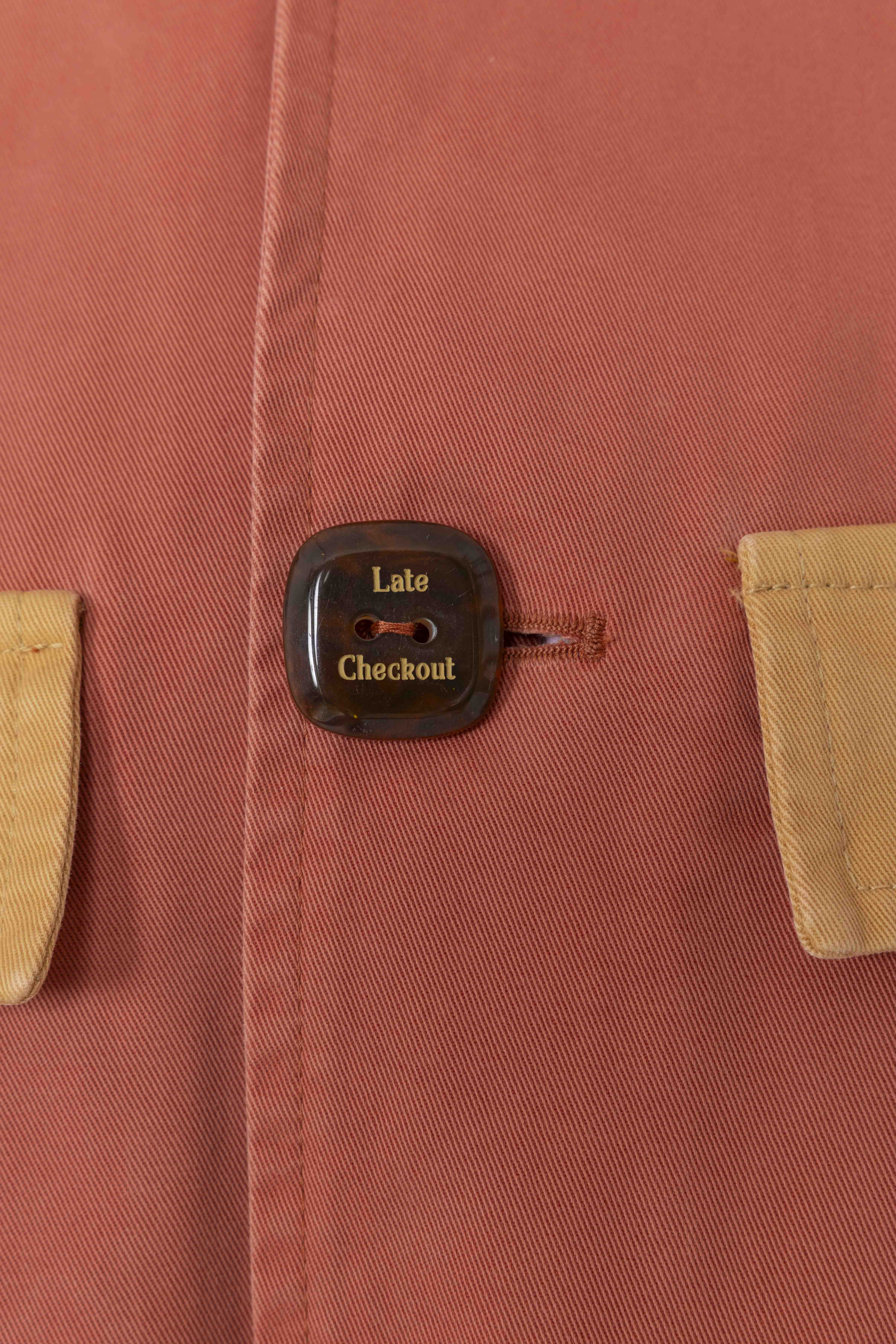 Late Checkout Terracotta Washed Hunting Jacket made from cotton, this jacket reinterprets classic hunting wear with bold color blocking. Featuring labeled buttons, an artwork on the left sleeve and a collar with a LC branded closure. The washed finish adds a lived-in edge, while multiple pockets and a structured silhouette nod to its utilitarian roots.