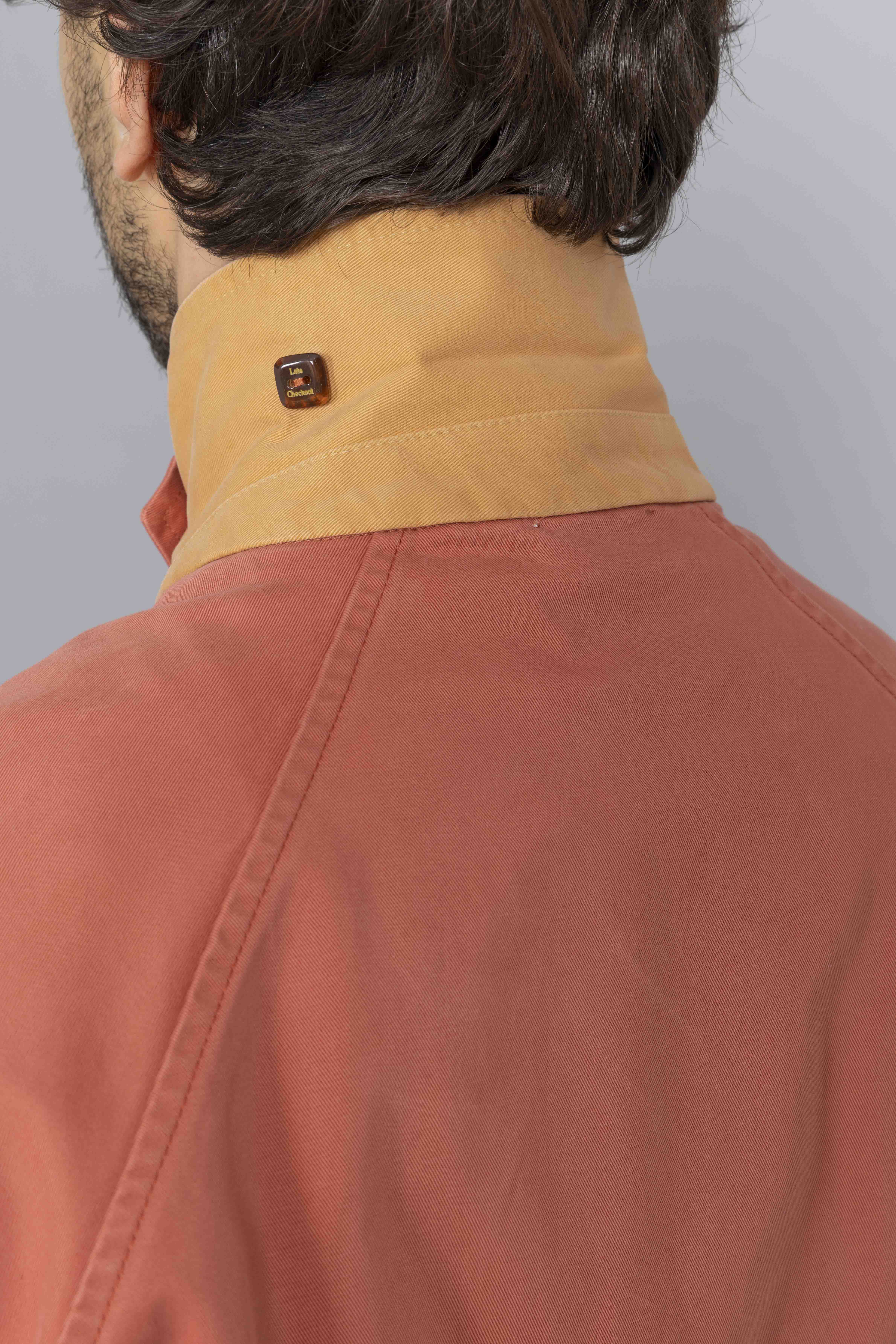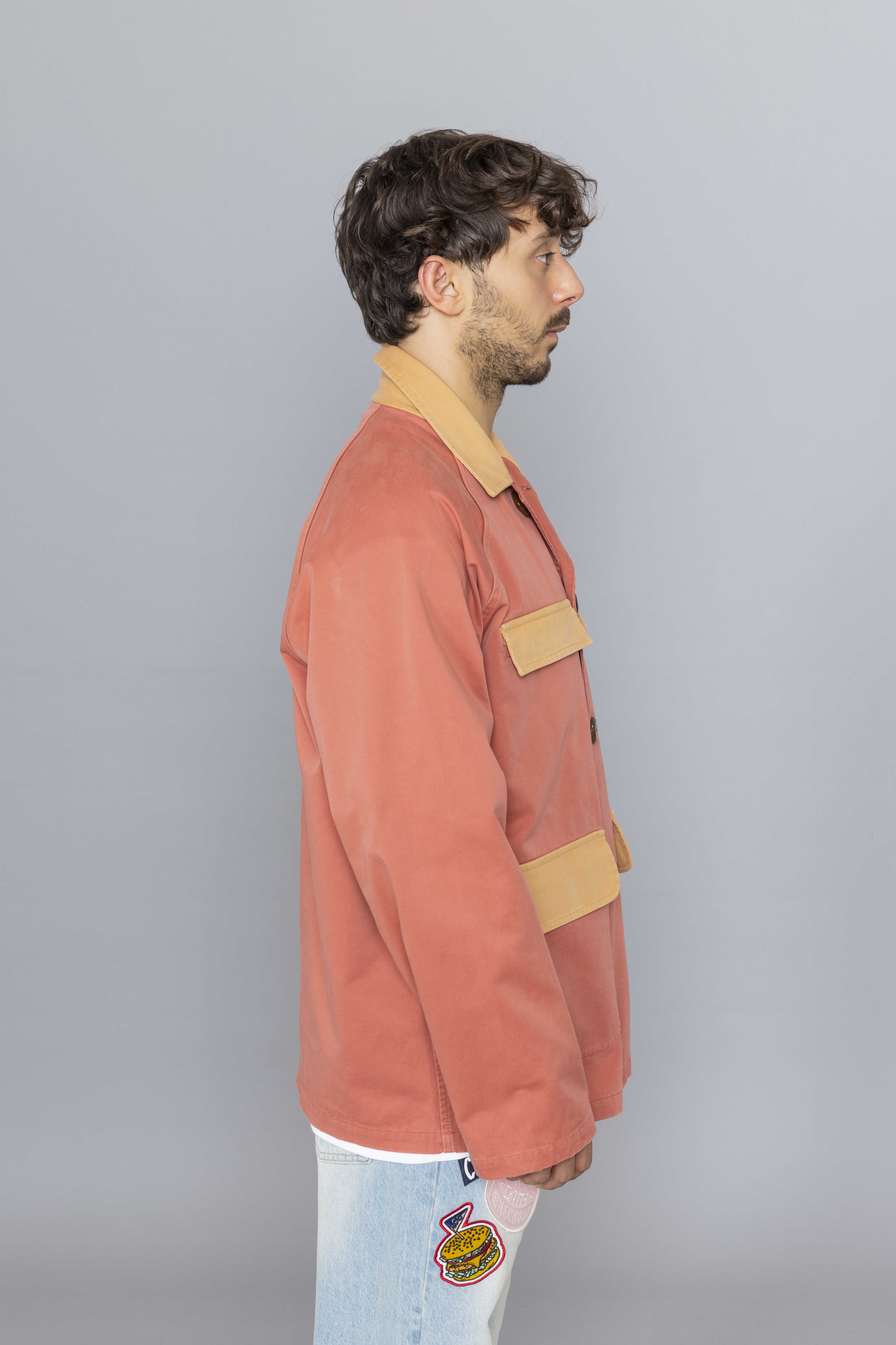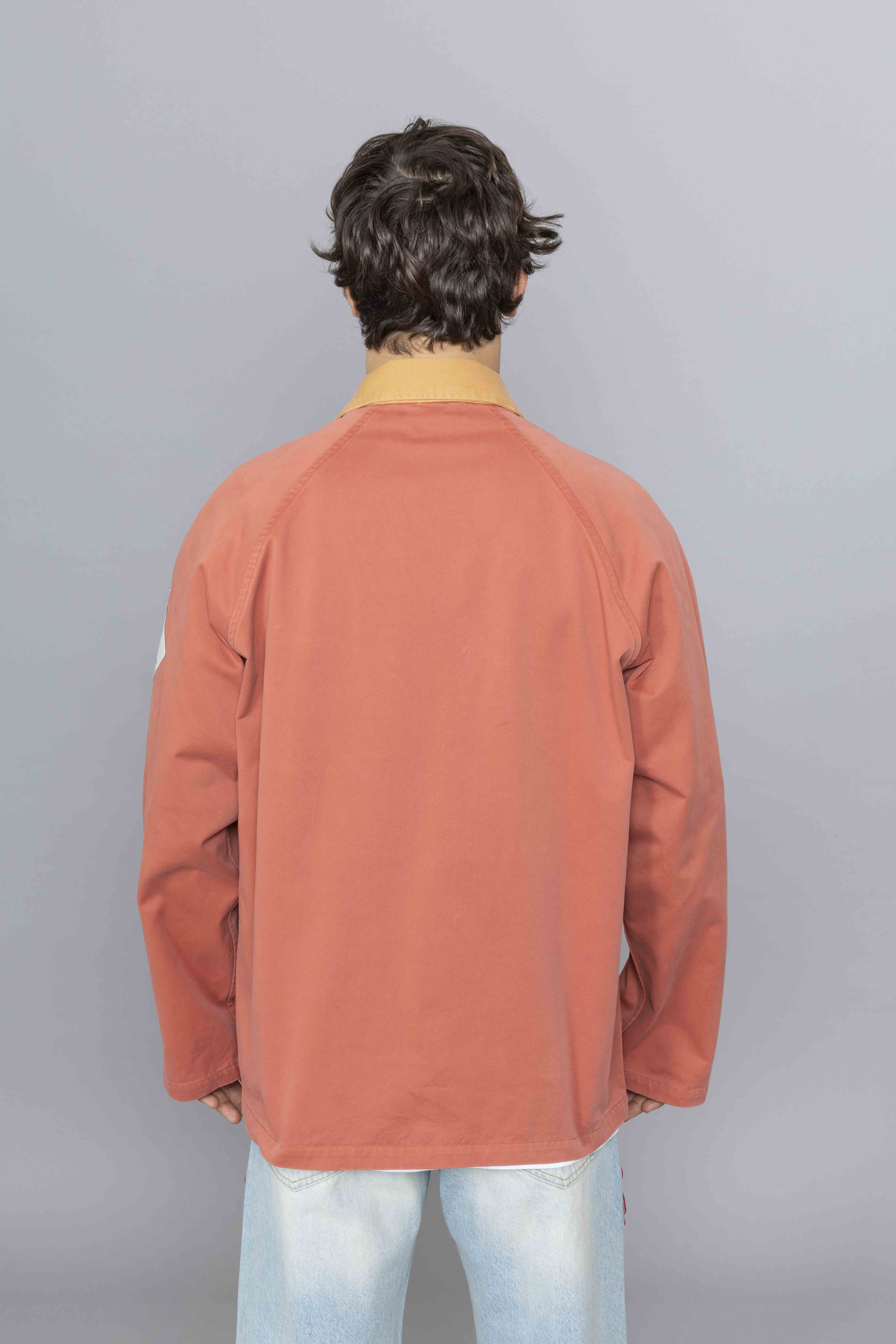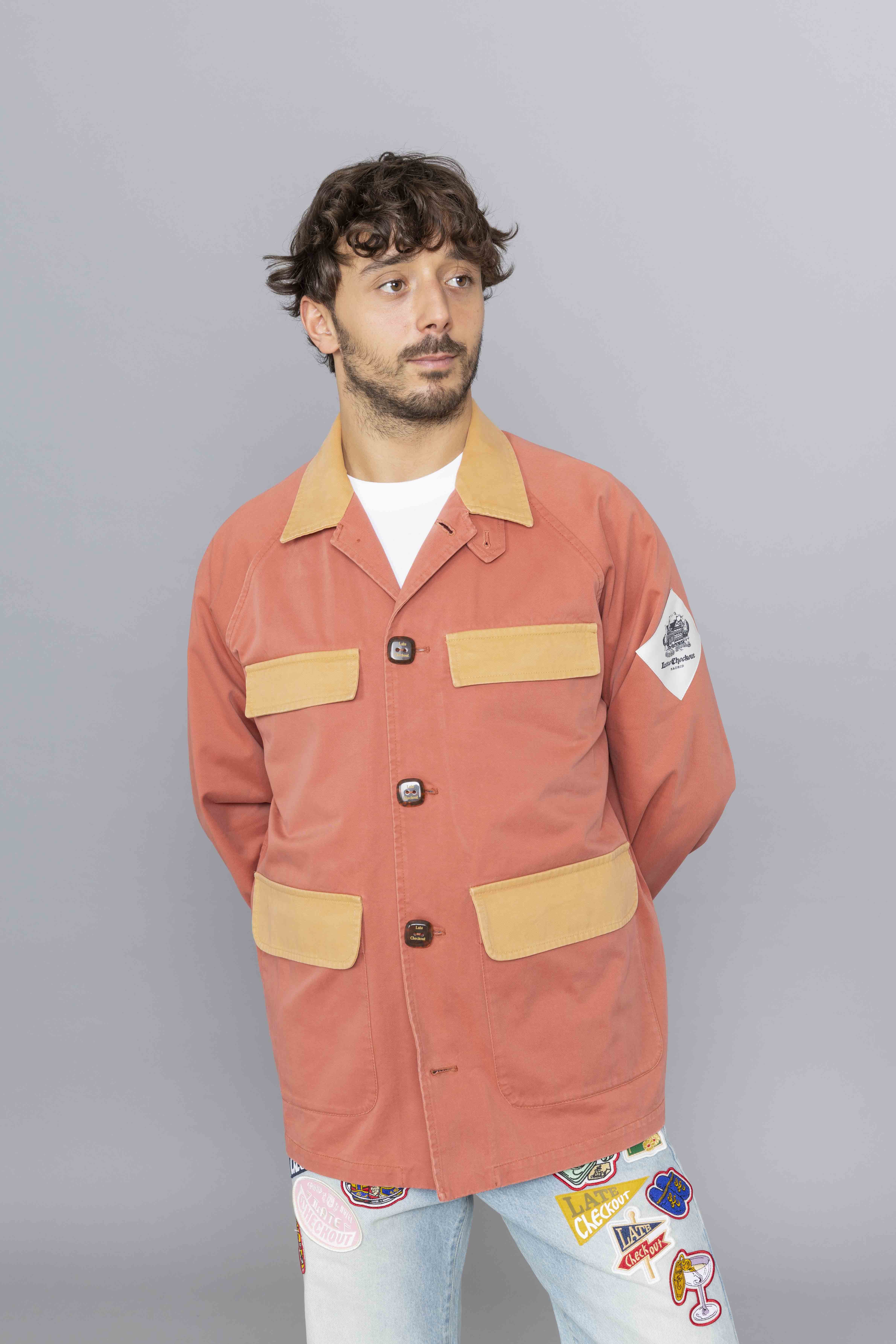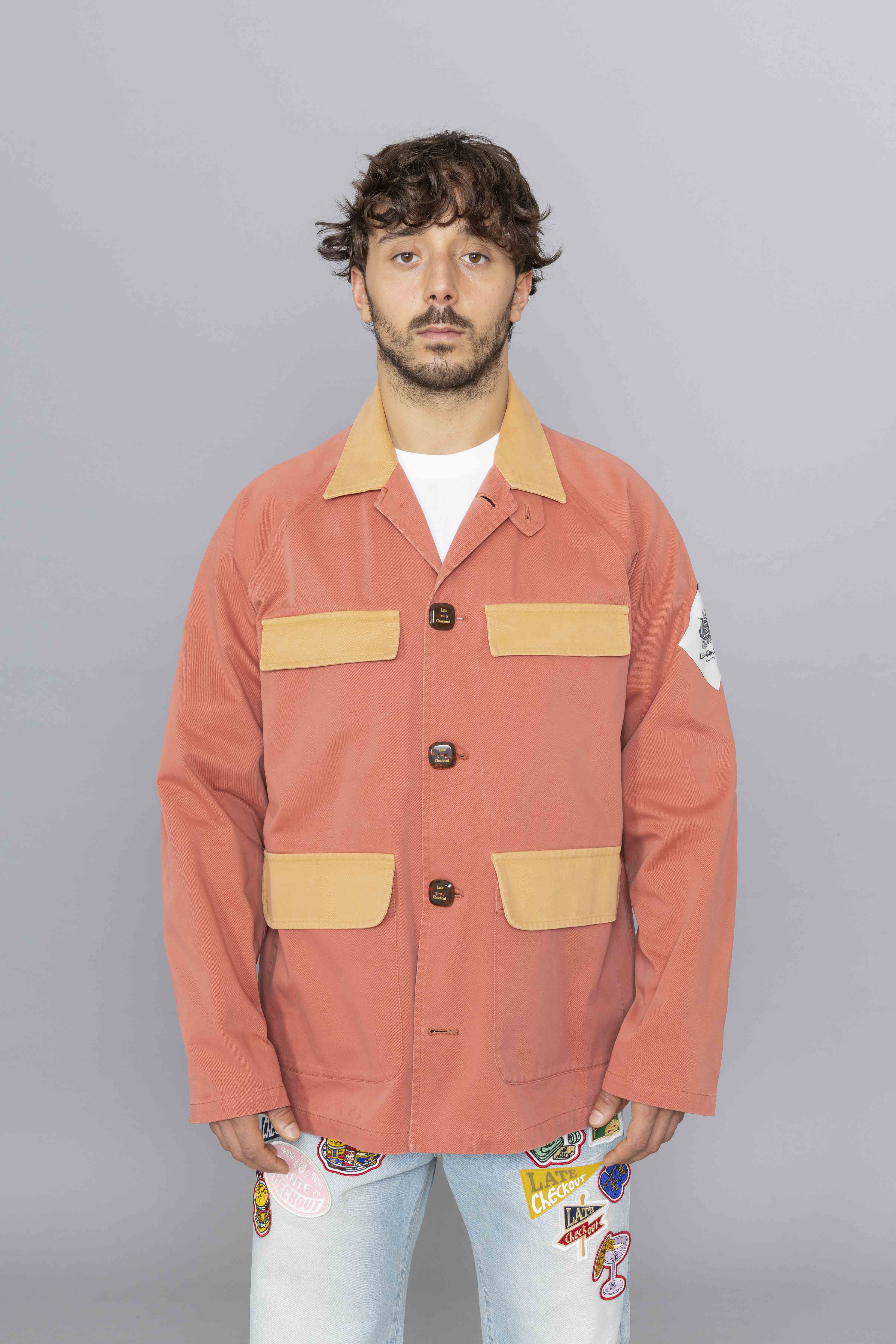 Late Checkout Terracotta Washed Hunting Jacket made from cotton, this jacket reinterprets classic hunting wear with bold color blocking. Featuring labeled buttons, an artwork on the left sleeve and a collar with a LC branded closure. The washed finish adds a lived-in edge, while multiple pockets and a structured silhouette nod to its utilitarian roots.