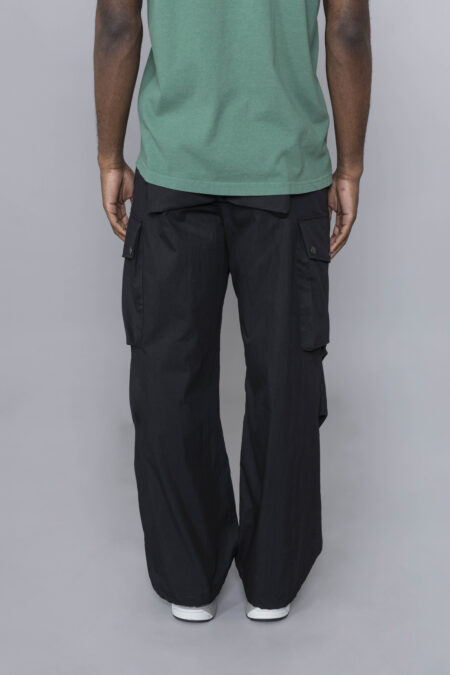 Needles Field Pant Black is cut from cotton and nylon blend, relaxed fit. Military inspirated loose pants with wide silhouette and voluminous feel. Featuring drawcord at waist, cargo pockets, large back pocket called monkey pocket, adjustable cuff, snap fastening and zip fly fastening.