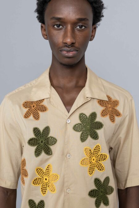 NN07 Julio 5452 Shirt Creme is cut from cotton, regular fit. Leisure shirt with open collar and flower patch embroidered on the front. Featuring mother of pearl front buttons and flat hemline.