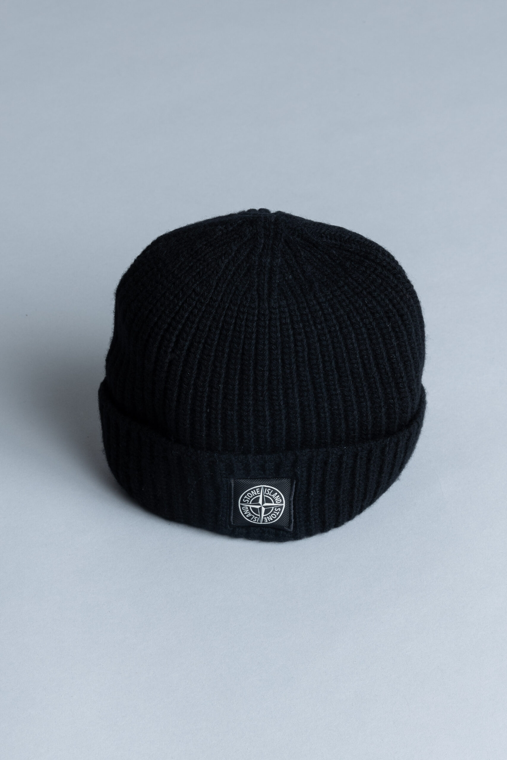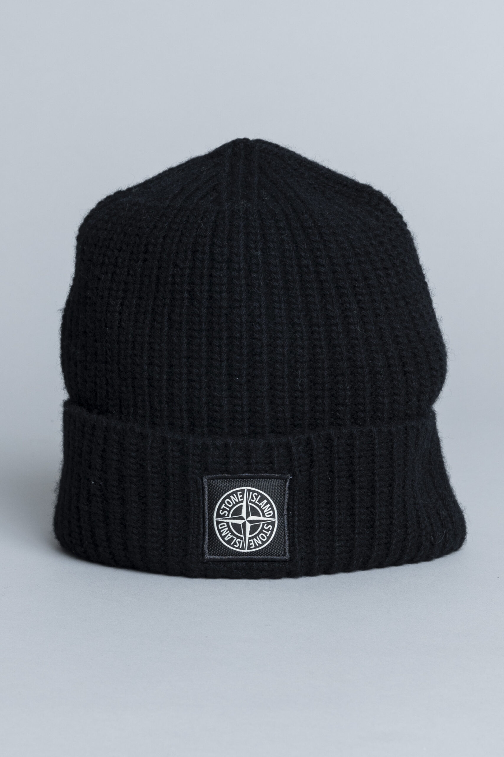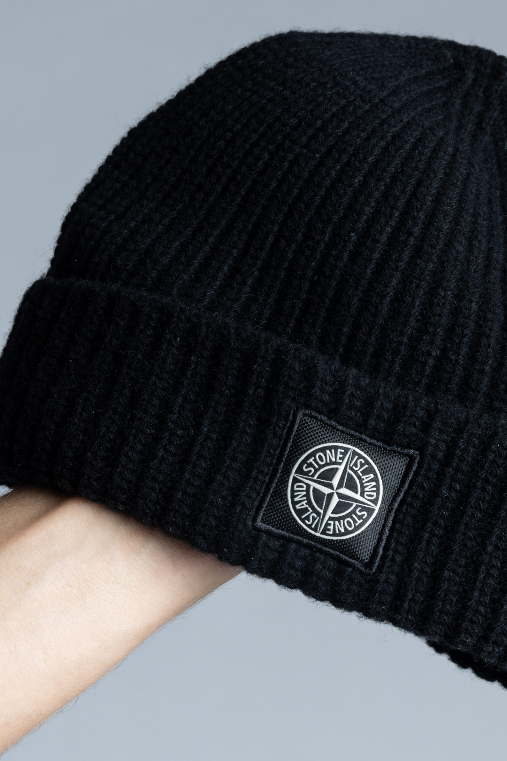 Stone Island Logo Patch Wool Beanie Black is cut from Geelong wool. Ribbed beanie with 5 gauge yarns and Stone Island patch logo on the cuffs.