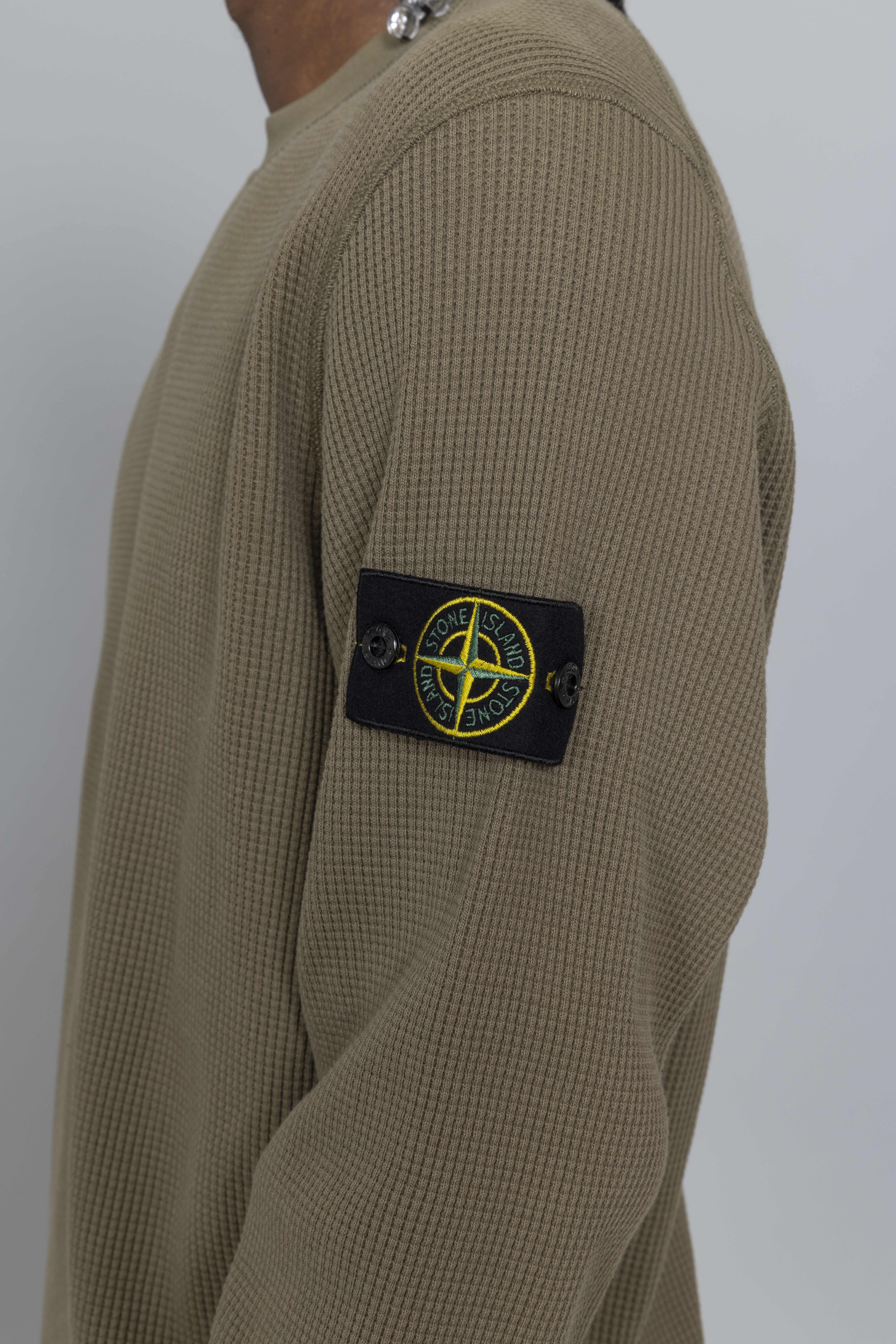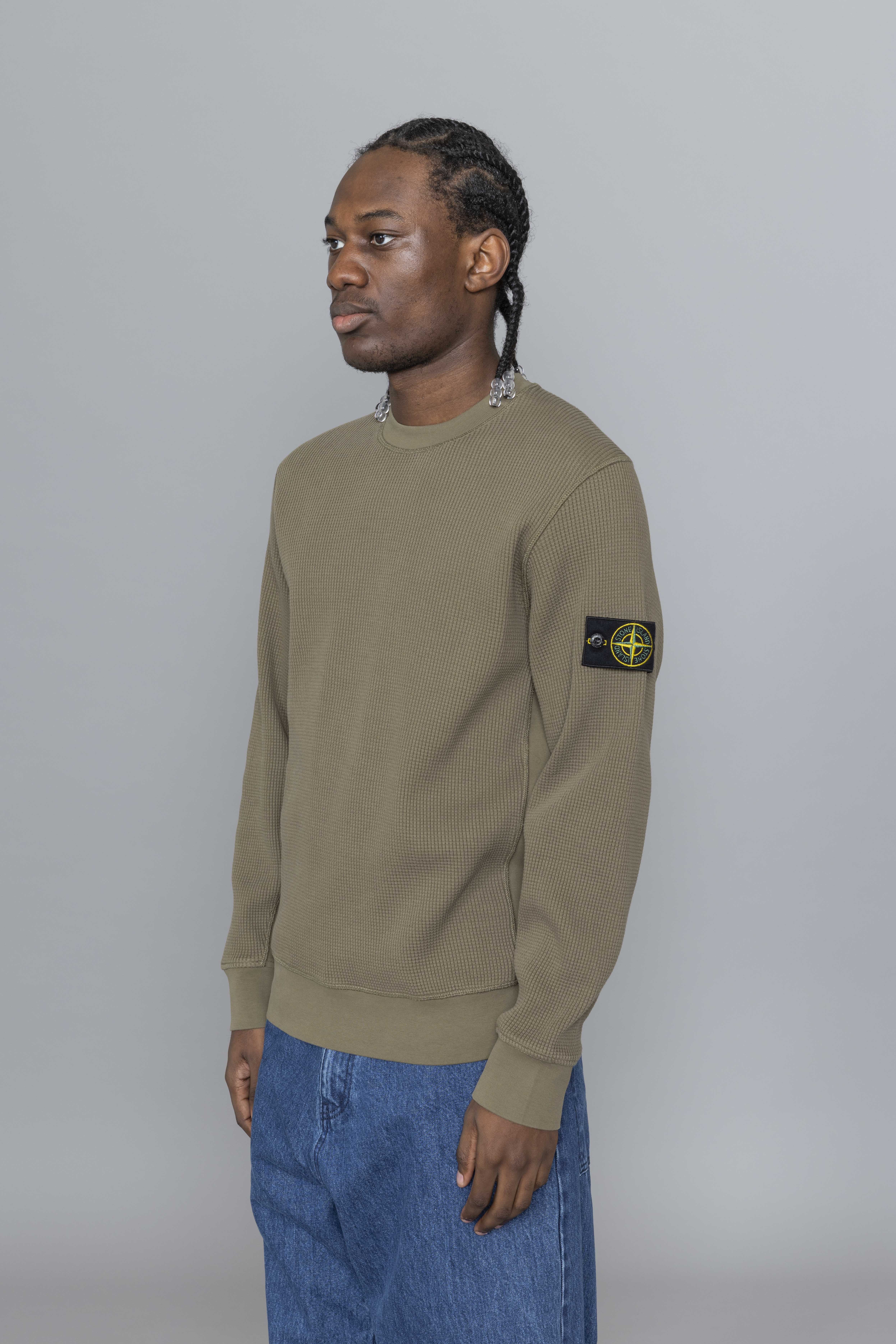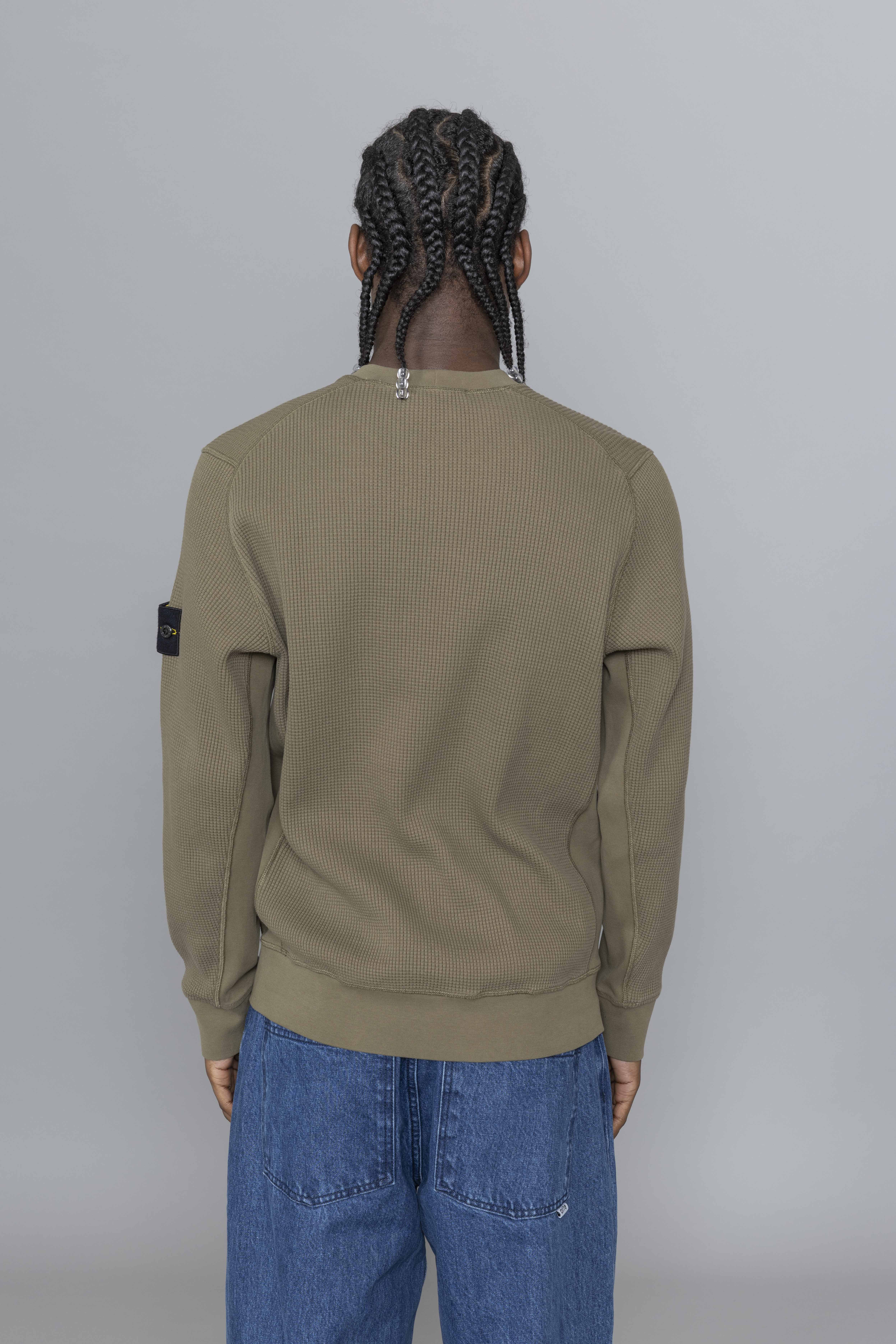 Stone Island Organic Cotton Waffle Fleece Military Green. Crafted from heavyweight organic cotton waffle fleece, this crewneck sweatshirt delivers warmth with a textured, structured finish. Designed with a ribbed neckline and raglan sleeves at the back for improved comfort and movement. Ribbed inserts along the sides and underarms enhance flexibility, while overlock stitching at the seams adds a technical edge. Finished with ribbed cuffs, a ribbed hem, and the signature Stone Island badge on the sleeve.