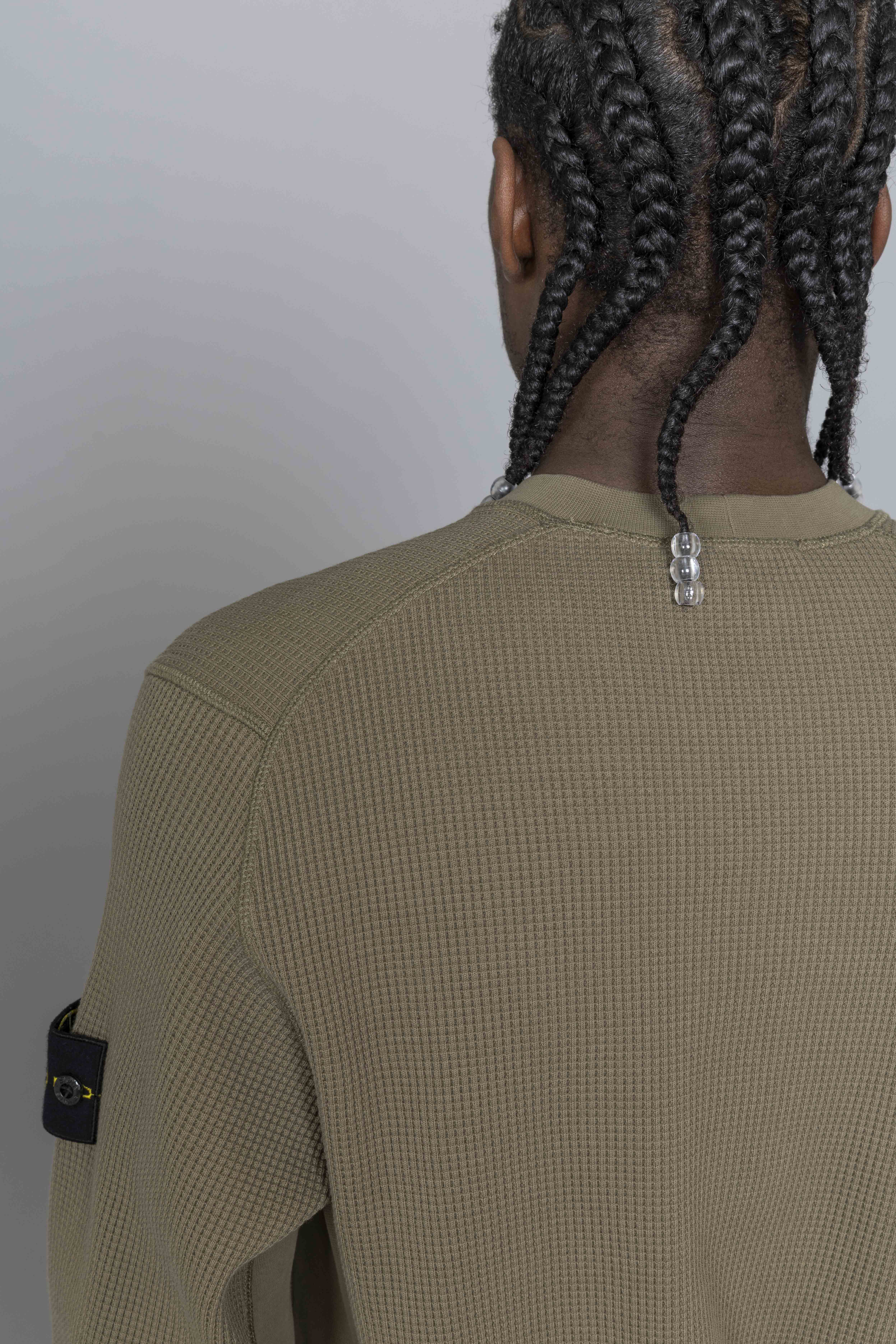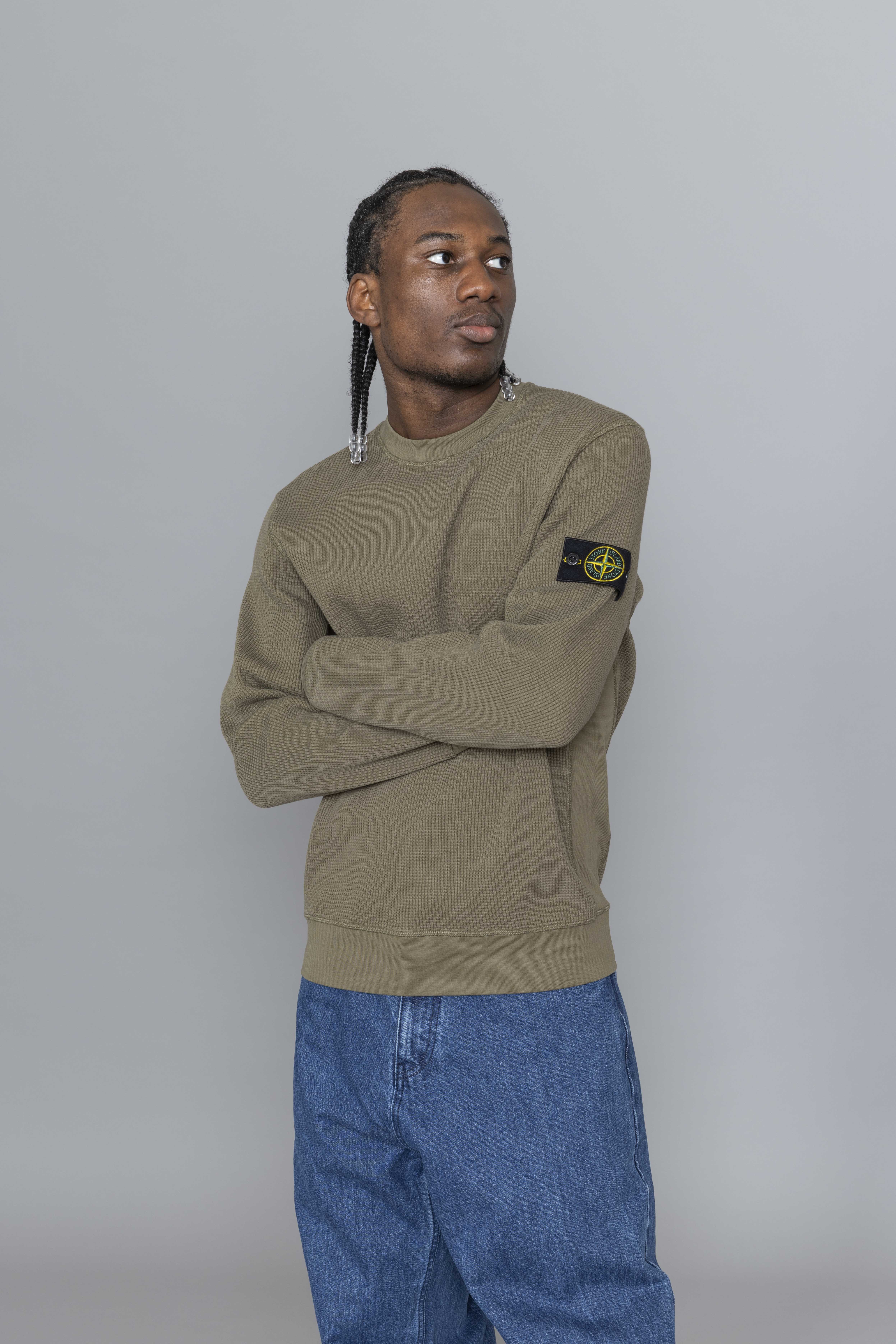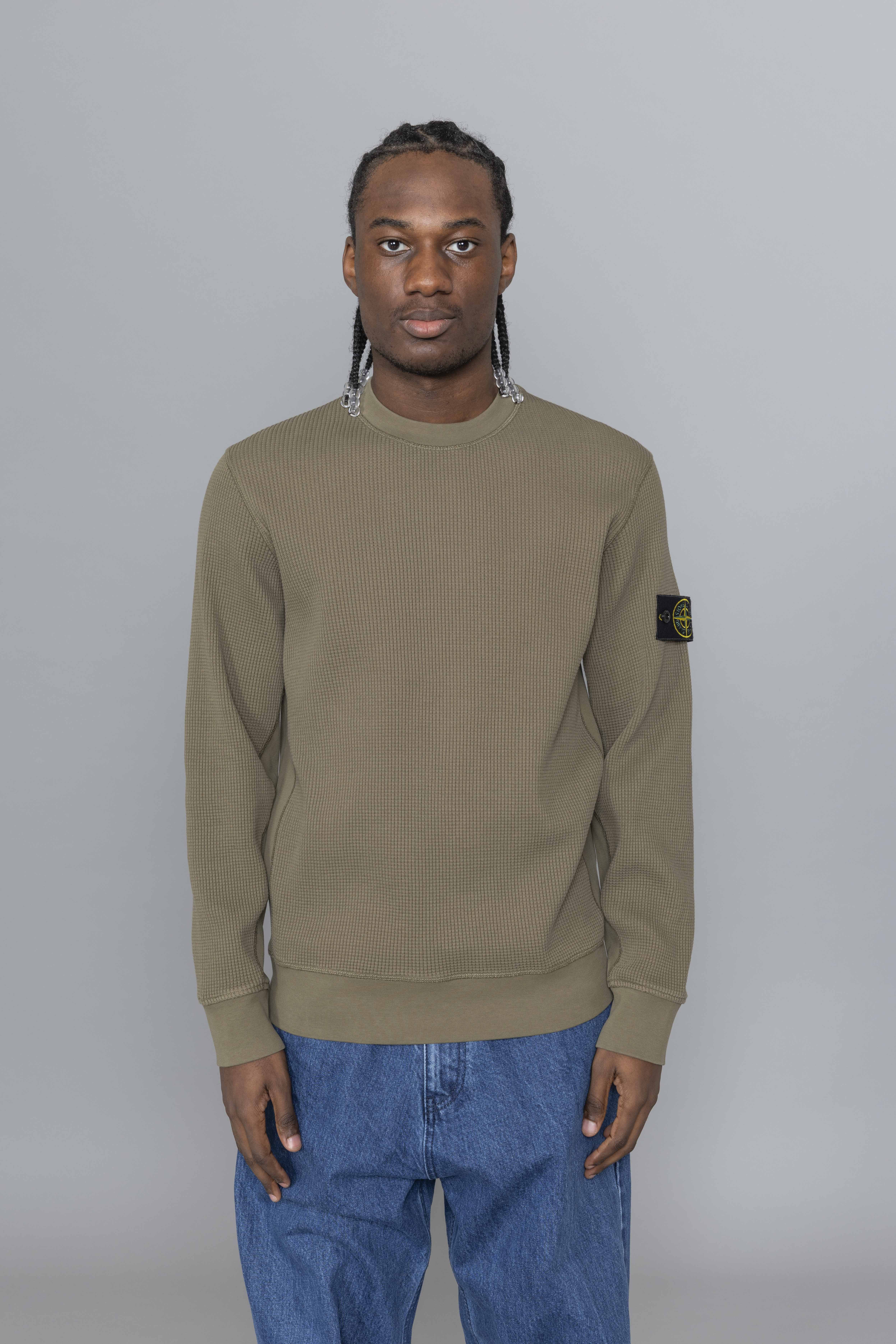 Stone Island Organic Cotton Waffle Fleece Military Green. Crafted from heavyweight organic cotton waffle fleece, this crewneck sweatshirt delivers warmth with a textured, structured finish. Designed with a ribbed neckline and raglan sleeves at the back for improved comfort and movement. Ribbed inserts along the sides and underarms enhance flexibility, while overlock stitching at the seams adds a technical edge. Finished with ribbed cuffs, a ribbed hem, and the signature Stone Island badge on the sleeve.