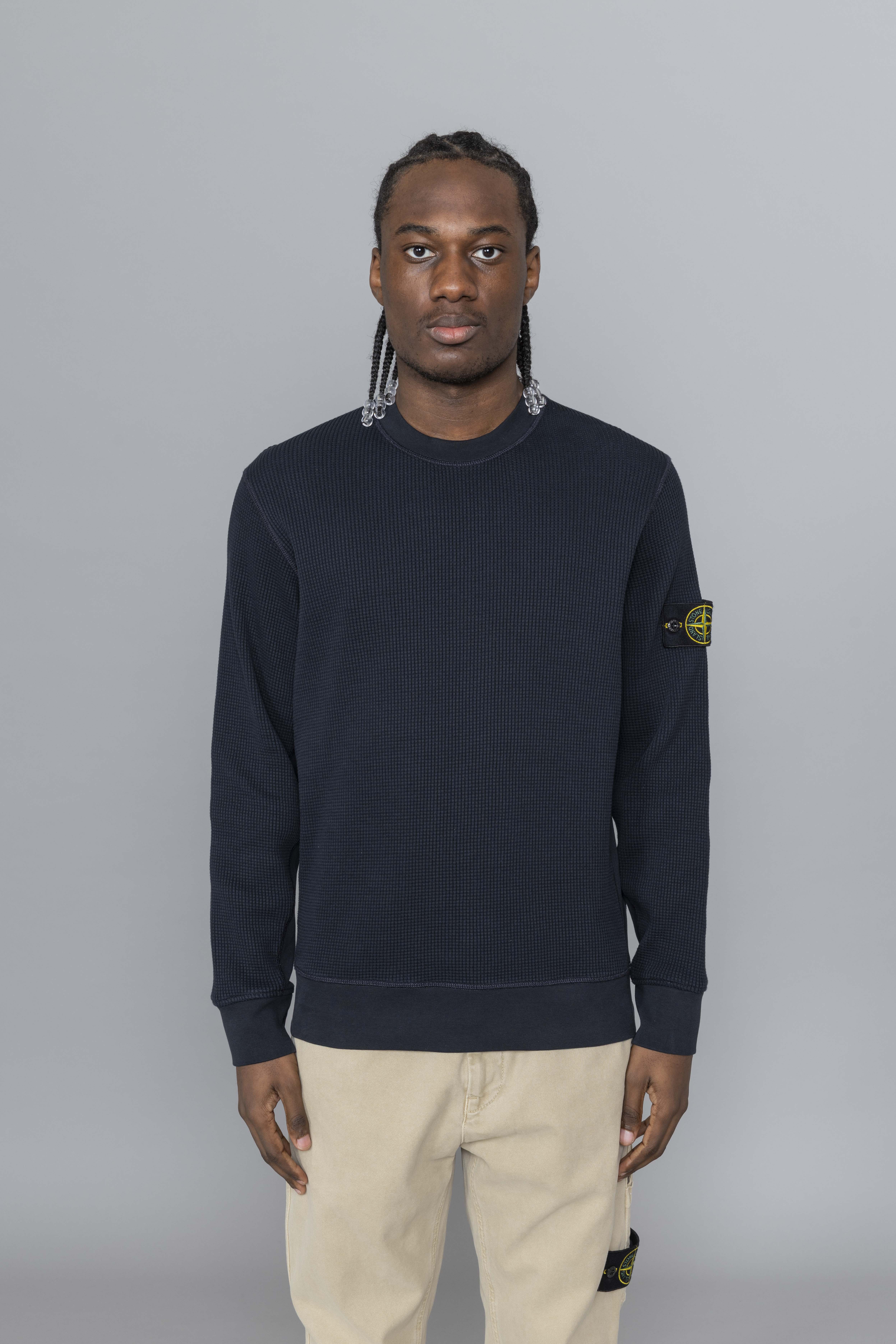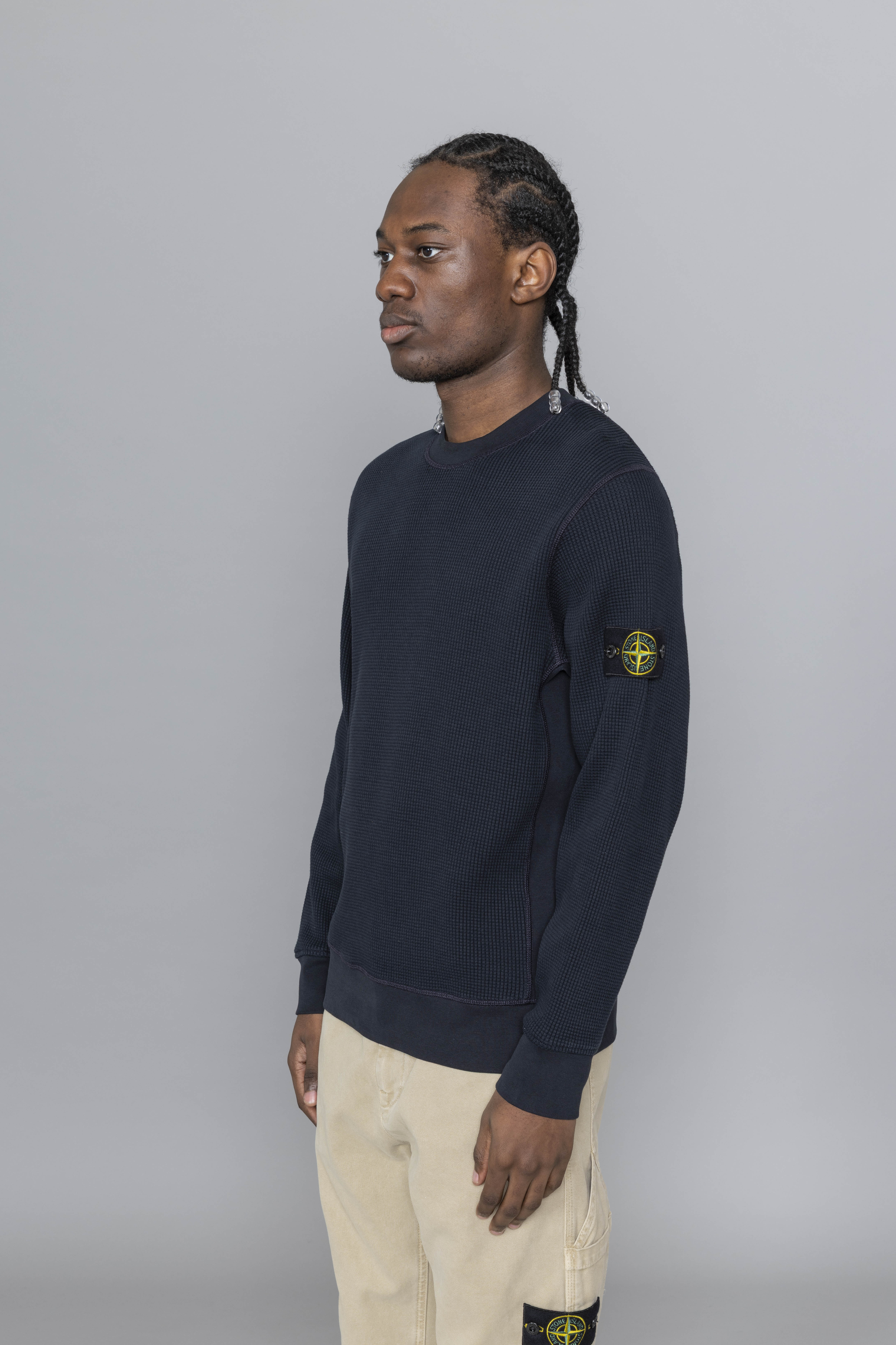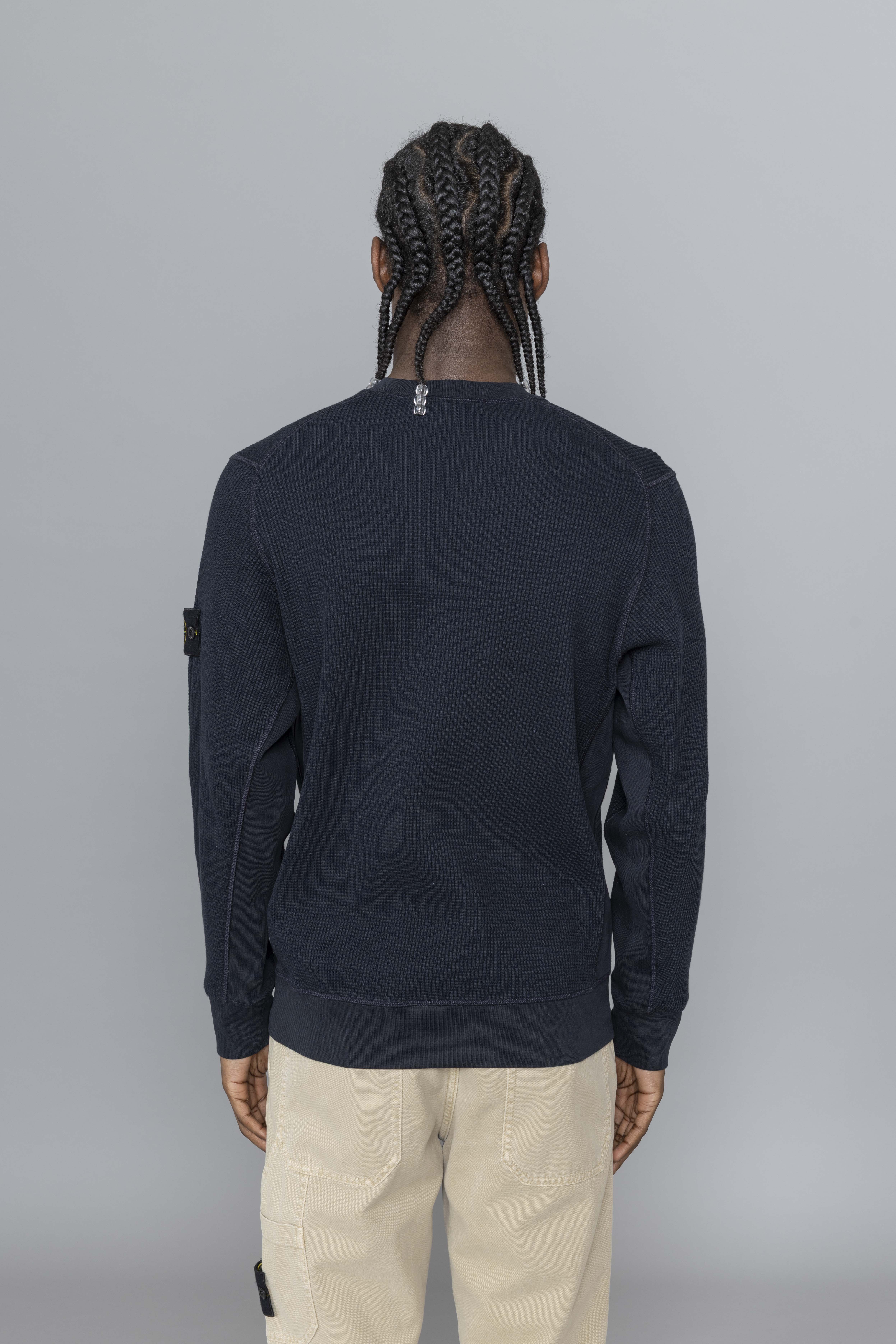 Stone Island Organic Cotton Waffle Fleece Navy Blue, Crafted from heavyweight organic cotton waffle fleece, this crewneck sweatshirt delivers warmth with a textured, structured finish. Designed with a ribbed neckline and raglan sleeves at the back for improved comfort and movement. Ribbed inserts along the sides and underarms enhance flexibility, while overlock stitching at the seams adds a technical edge. Finished with ribbed cuffs, a ribbed hem, and the signature Stone Island badge on the sleeve.