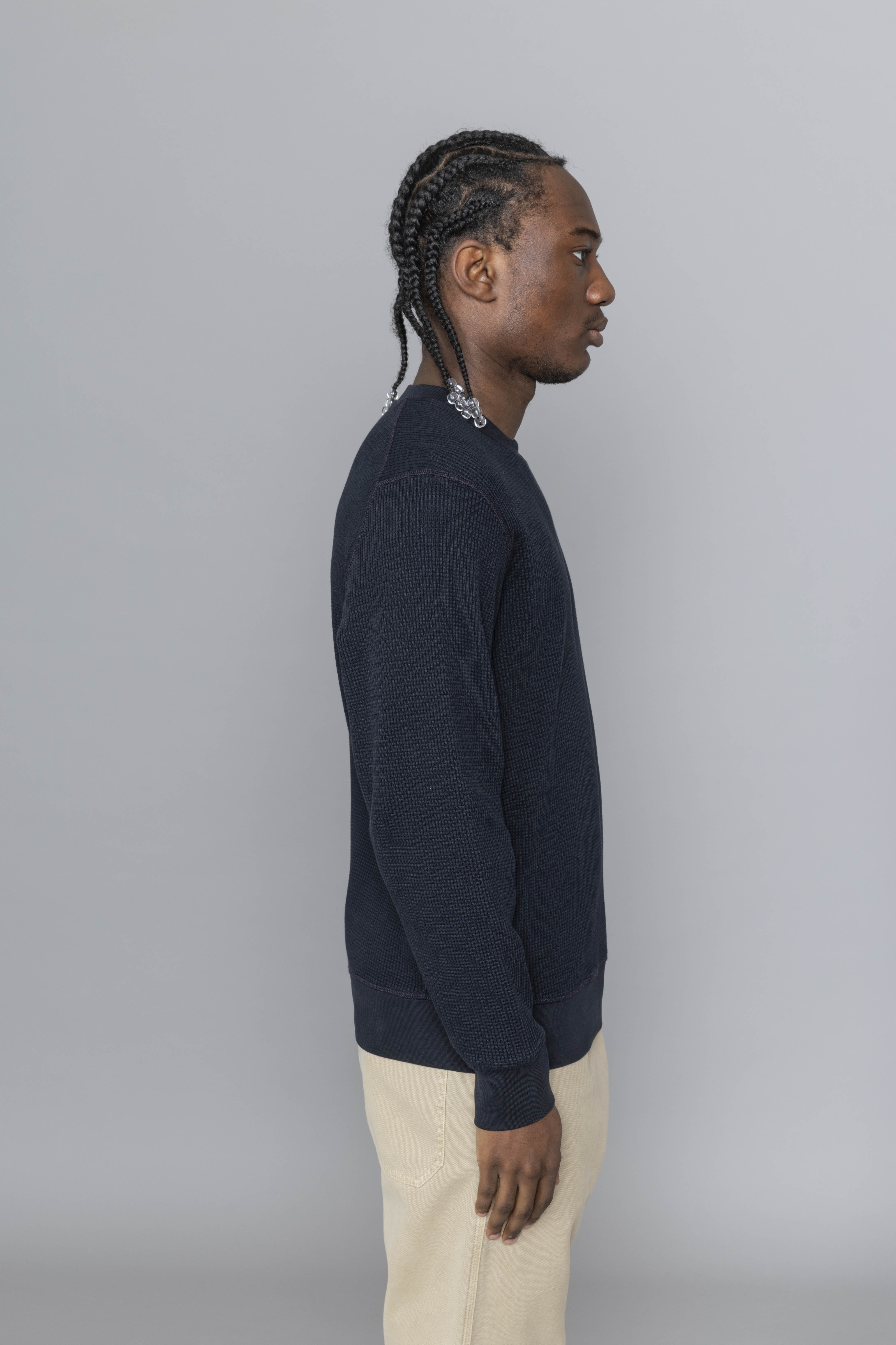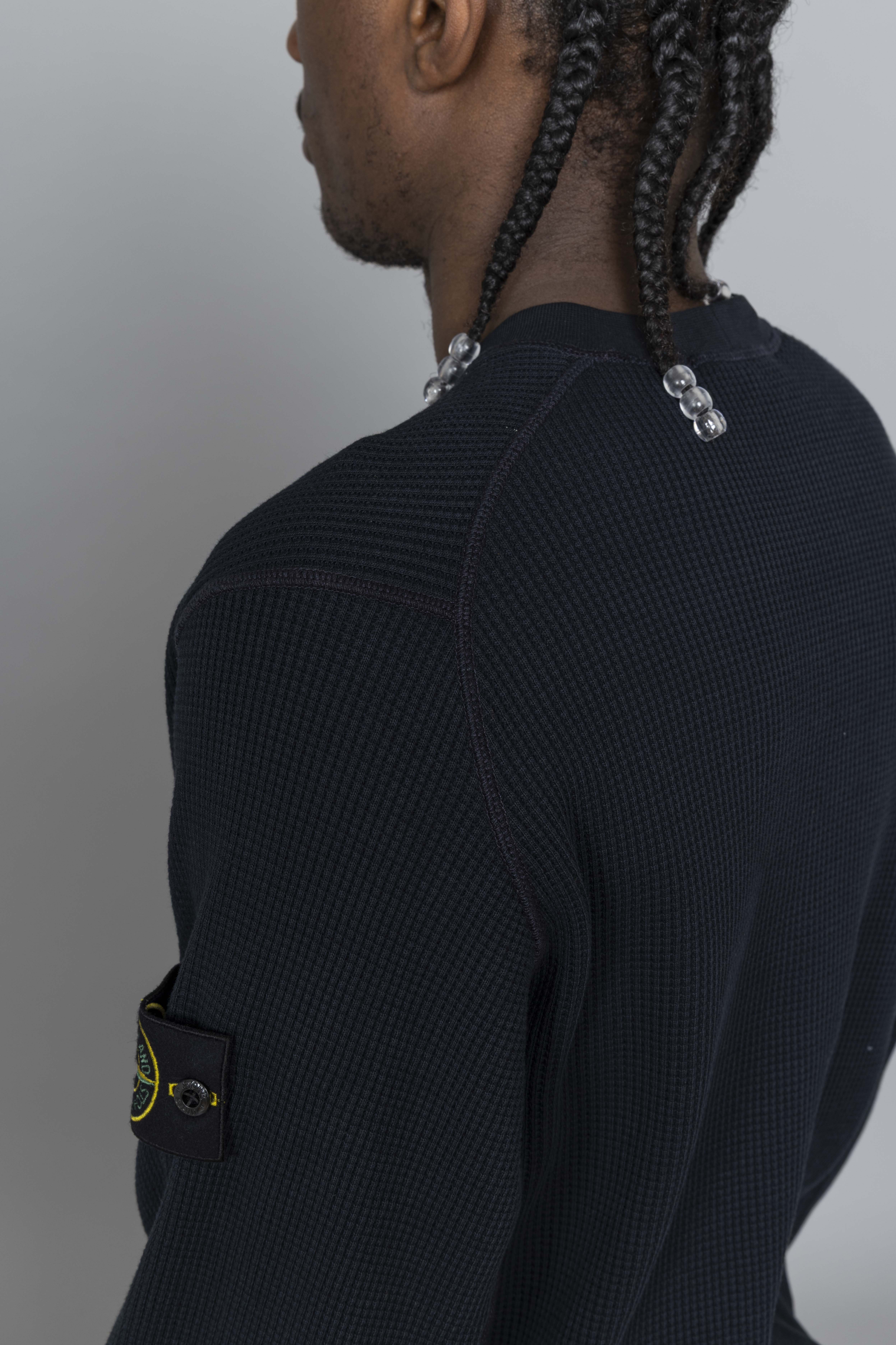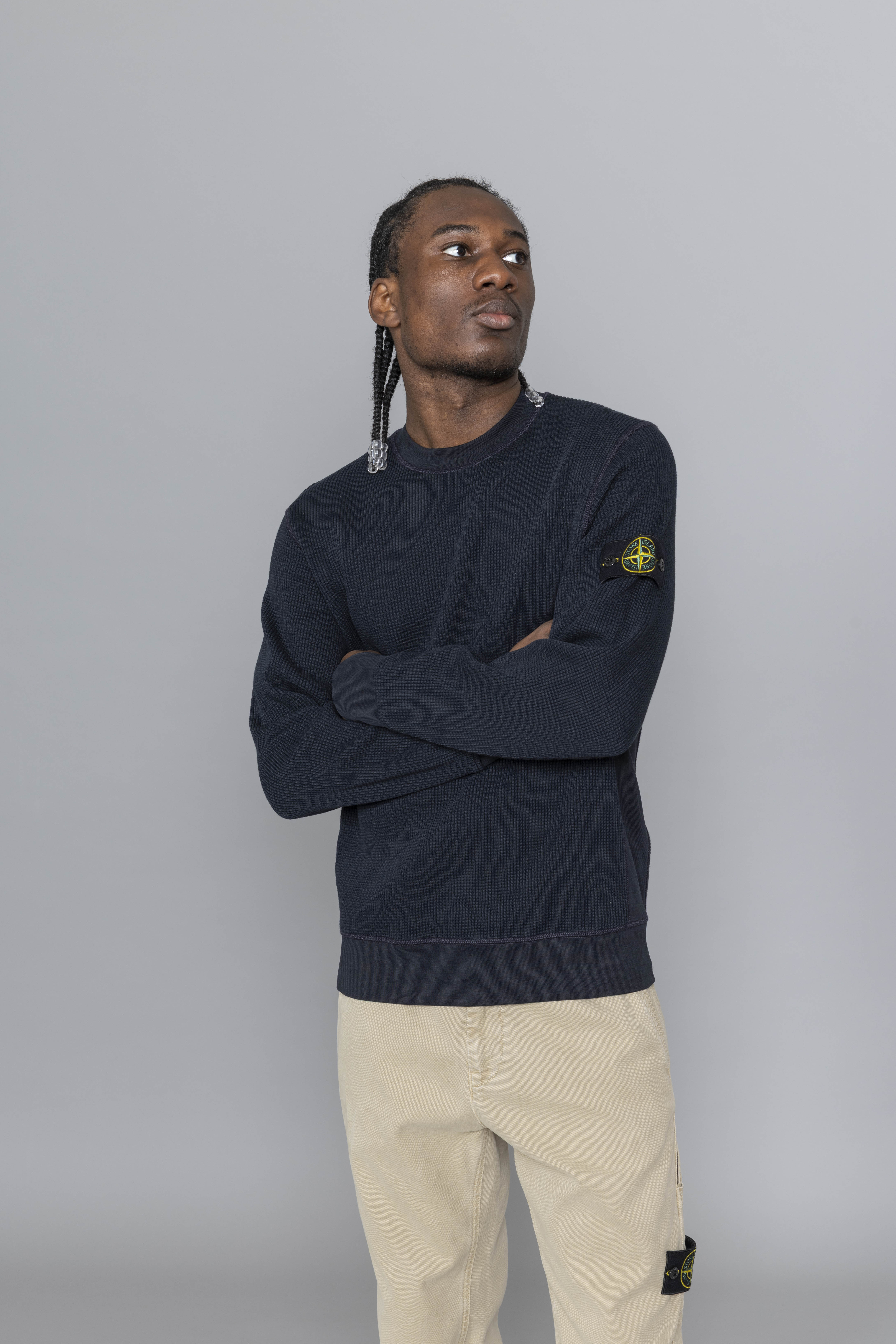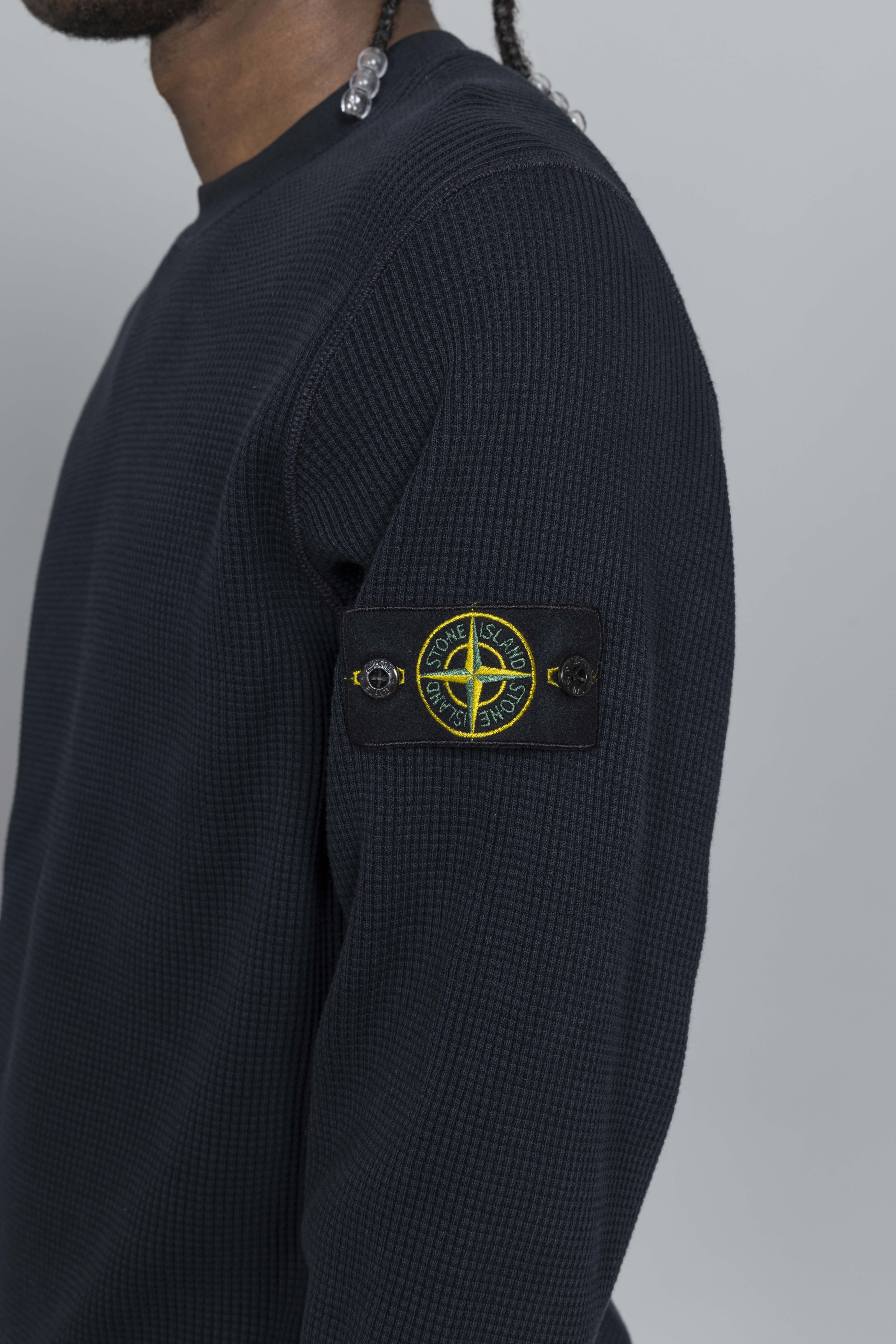 Stone Island Organic Cotton Waffle Fleece Navy Blue, Crafted from heavyweight organic cotton waffle fleece, this crewneck sweatshirt delivers warmth with a textured, structured finish. Designed with a ribbed neckline and raglan sleeves at the back for improved comfort and movement. Ribbed inserts along the sides and underarms enhance flexibility, while overlock stitching at the seams adds a technical edge. Finished with ribbed cuffs, a ribbed hem, and the signature Stone Island badge on the sleeve.