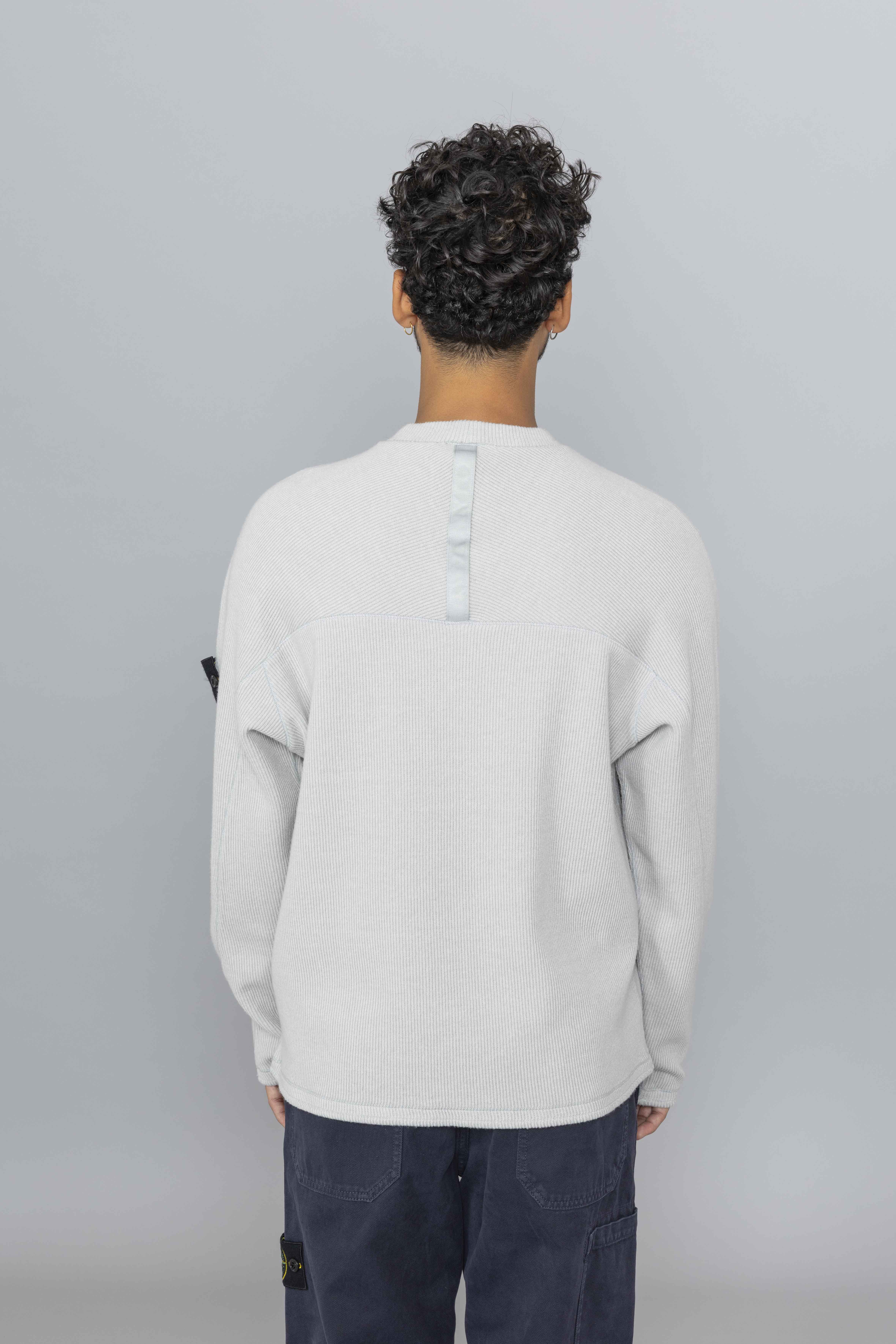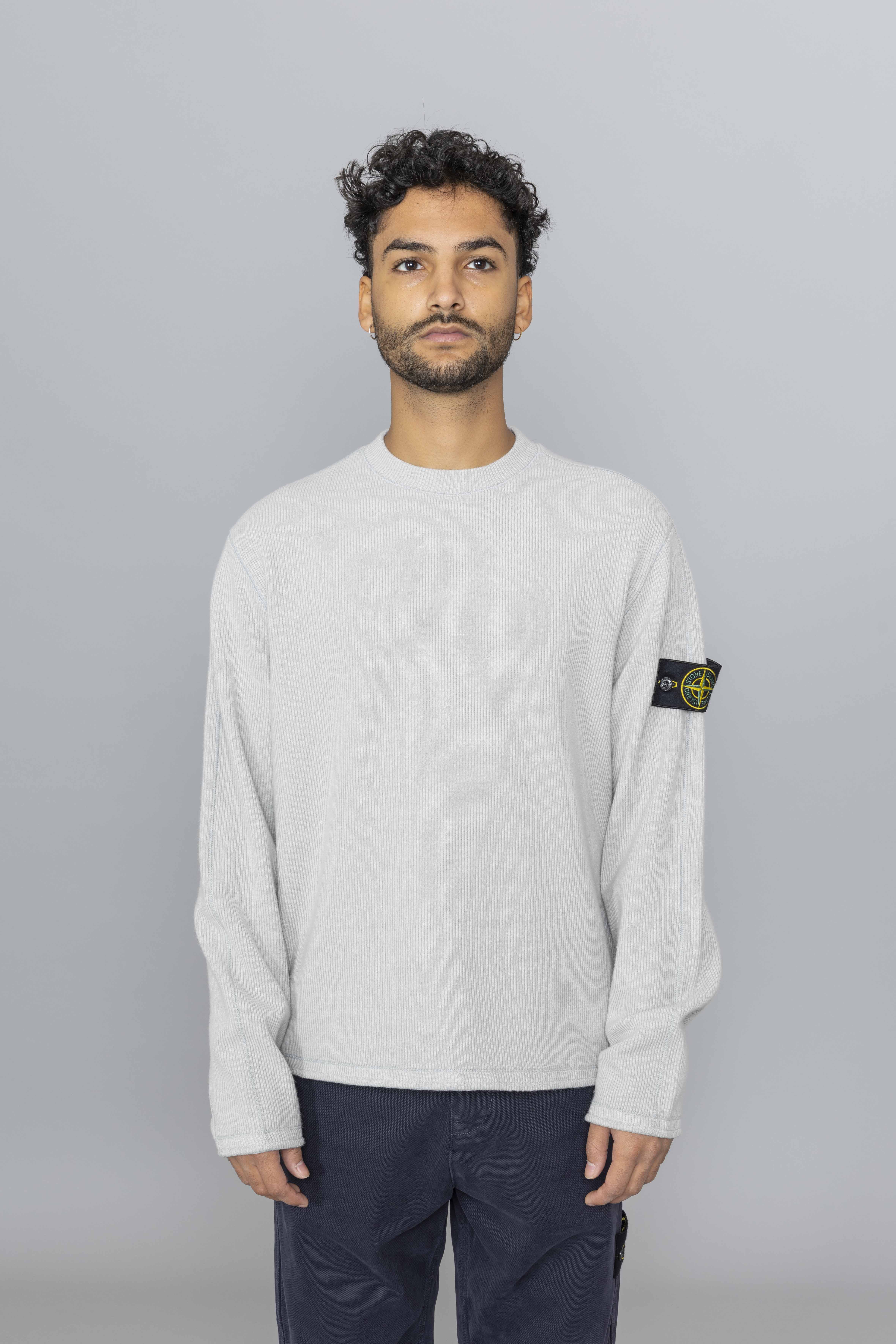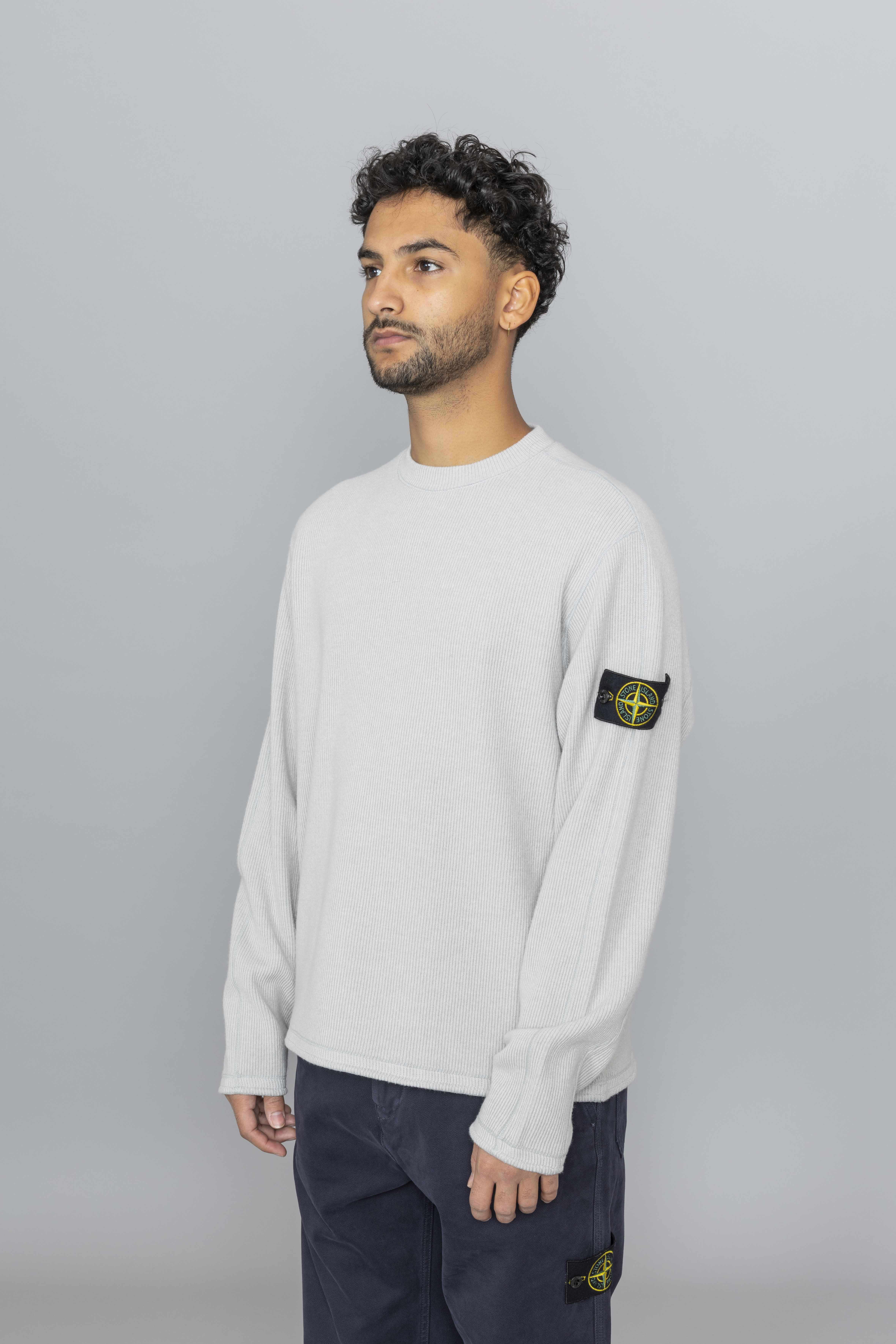Stone Island Ribbed Wool Nylon Crewneck in Pearl Grey, cut from a refined wool-nylon ribbed knit, this crewneck sweatshirt features a comfort fit with upgraded texture and structure. A back yoke detail adds tailored visual depth, while ribbed trims ensure lasting shape and fit. Finished with the signature Stone Island Compass badge on the sleeve.