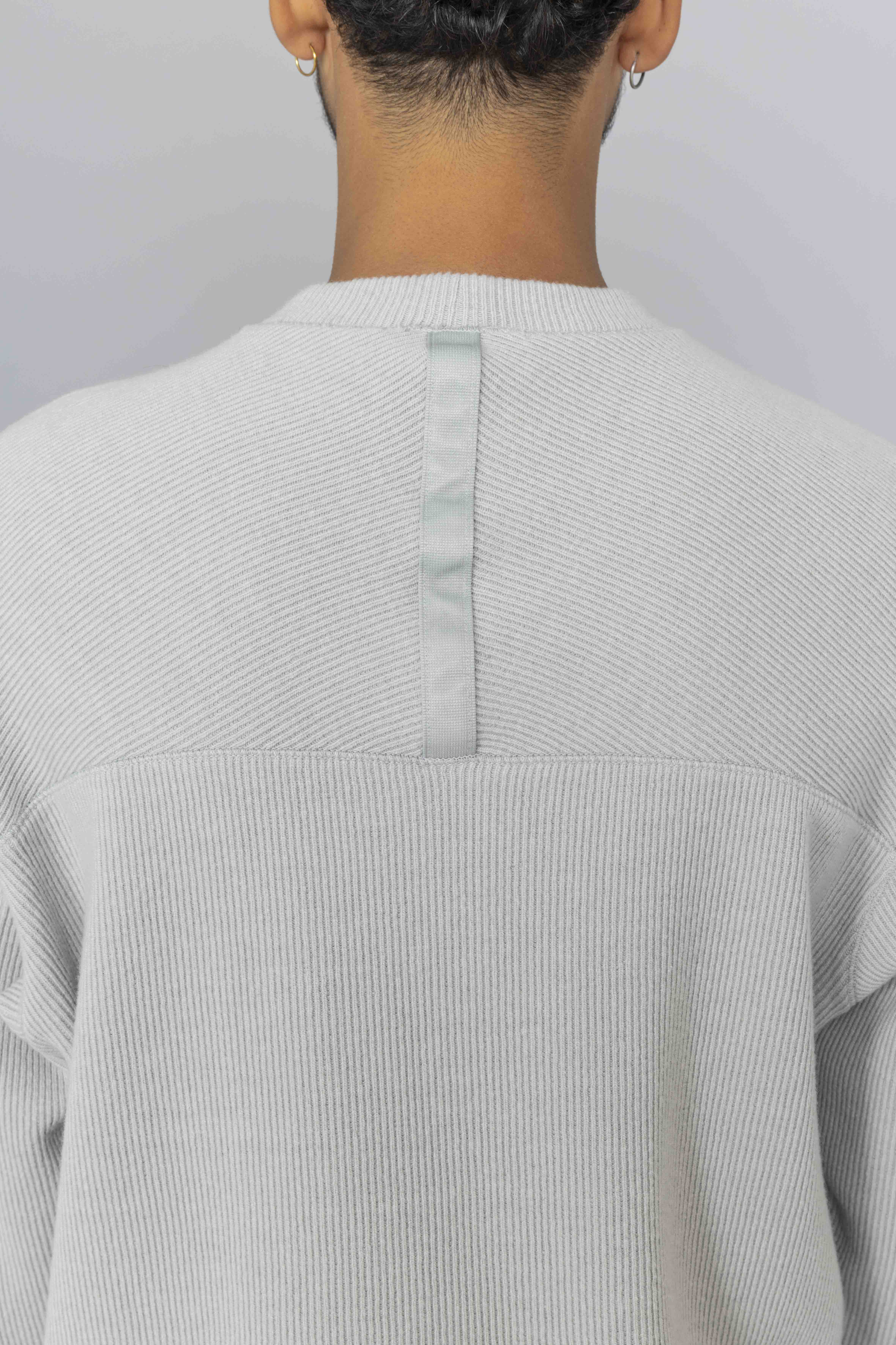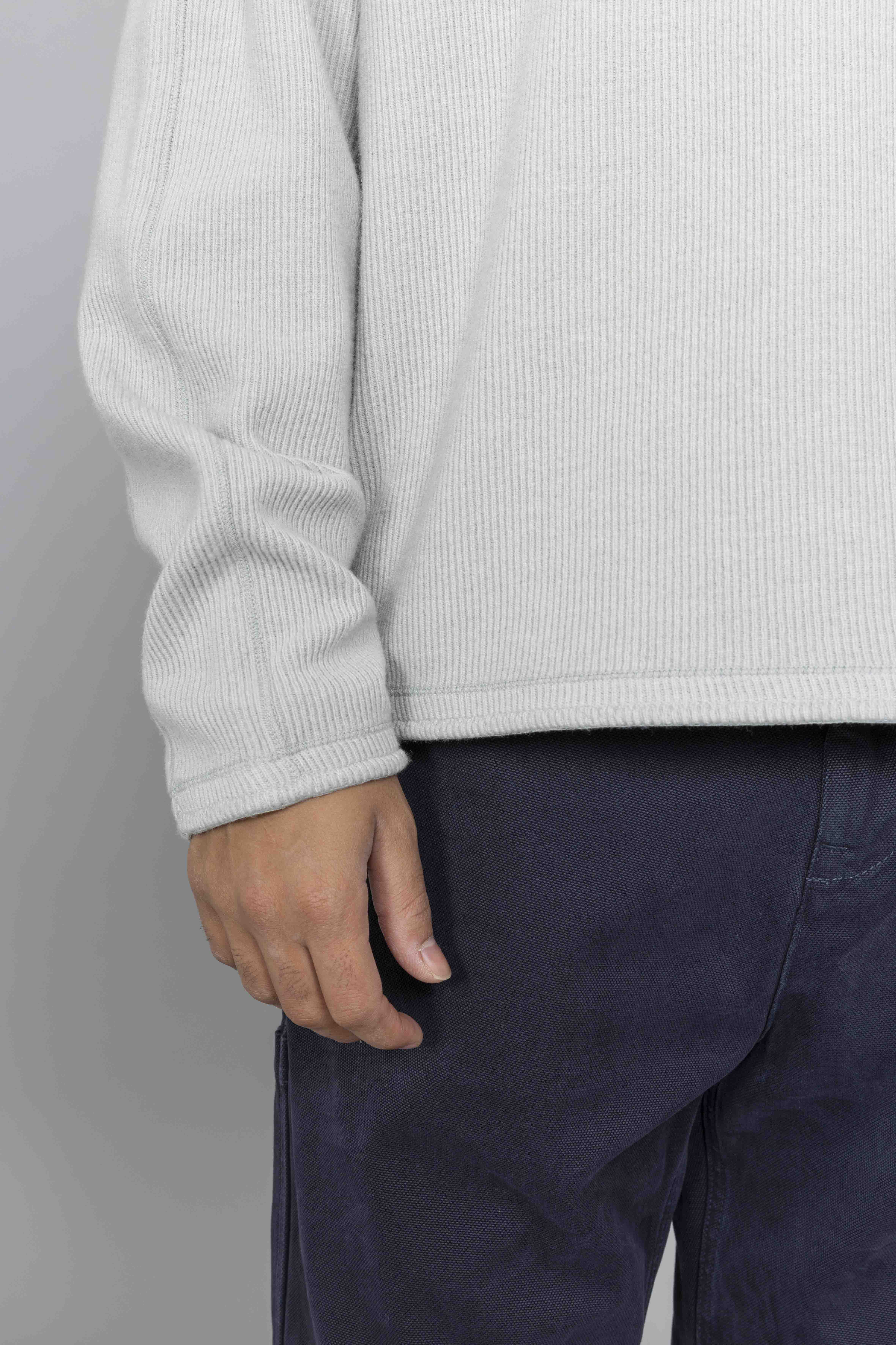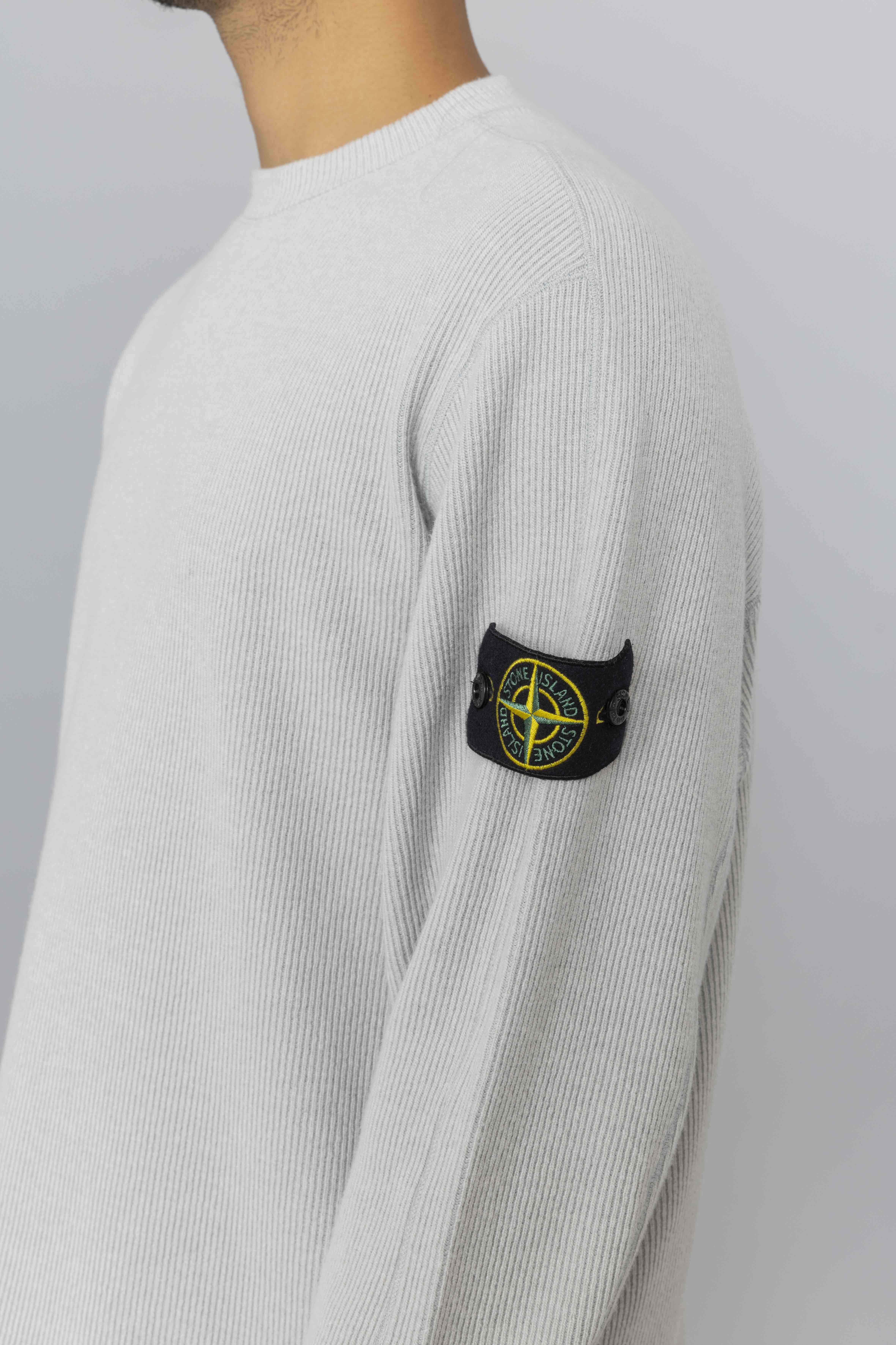 Stone Island Ribbed Wool Nylon Crewneck in Pearl Grey, cut from a refined wool-nylon ribbed knit, this crewneck sweatshirt features a comfort fit with upgraded texture and structure. A back yoke detail adds tailored visual depth, while ribbed trims ensure lasting shape and fit. Finished with the signature Stone Island Compass badge on the sleeve.