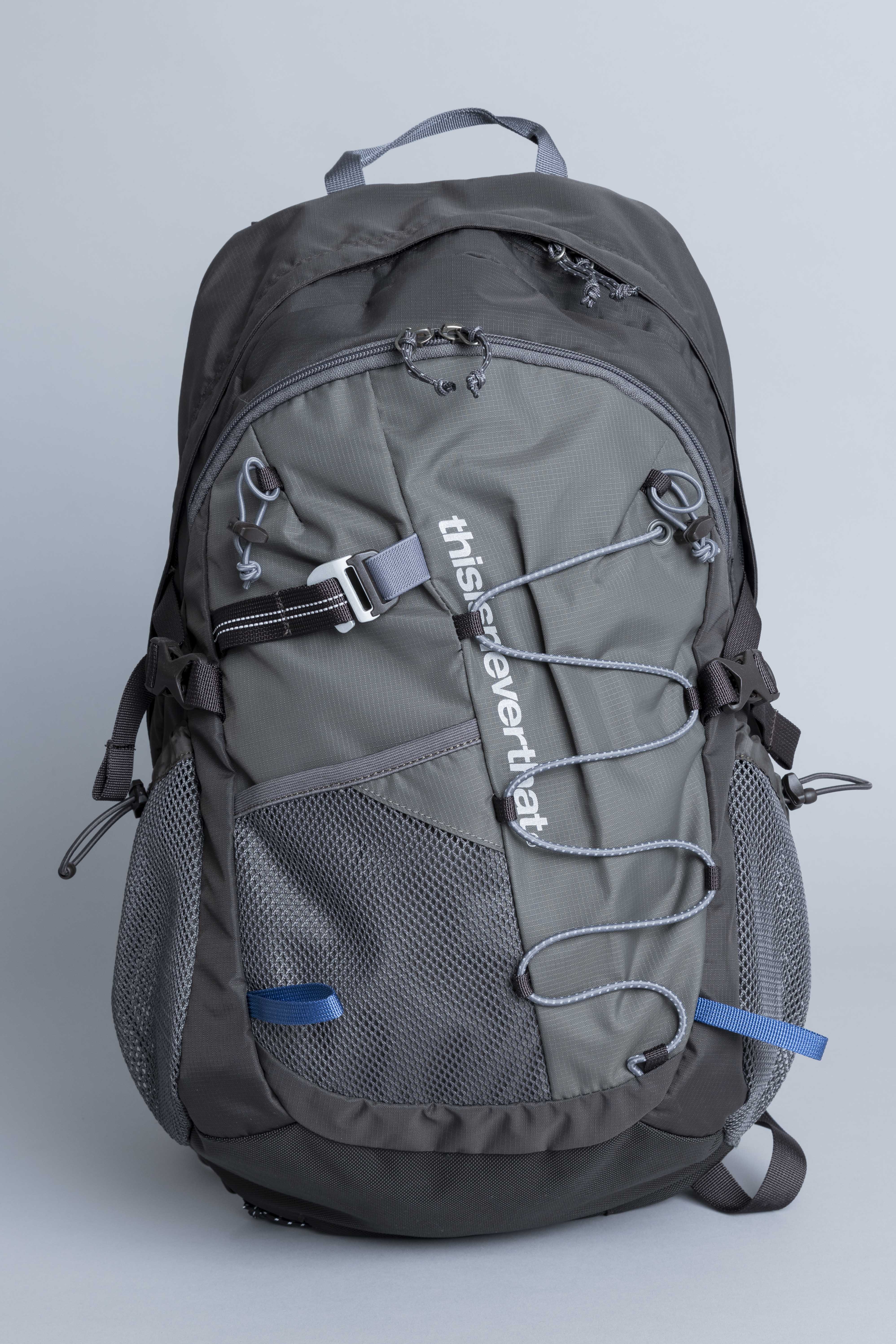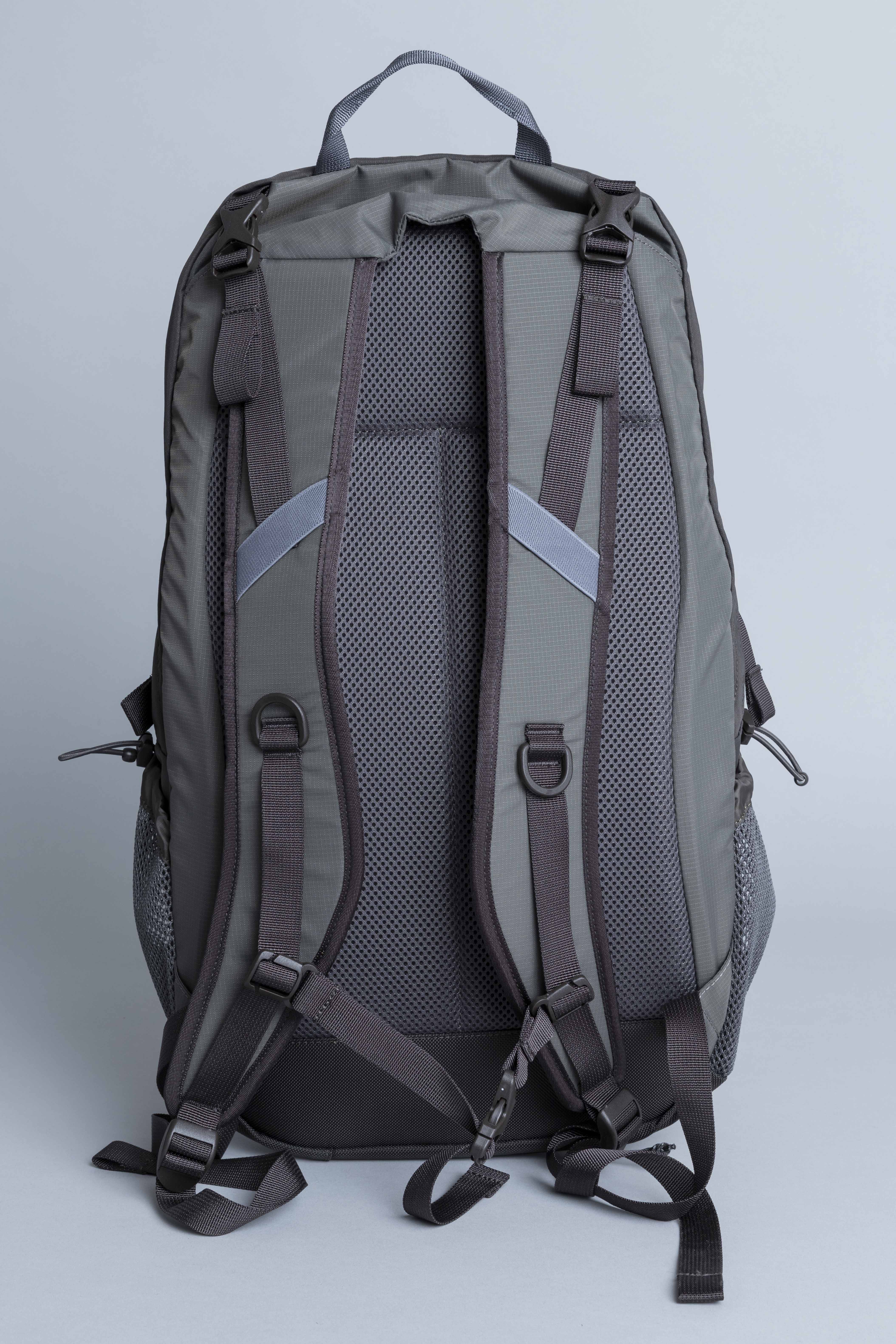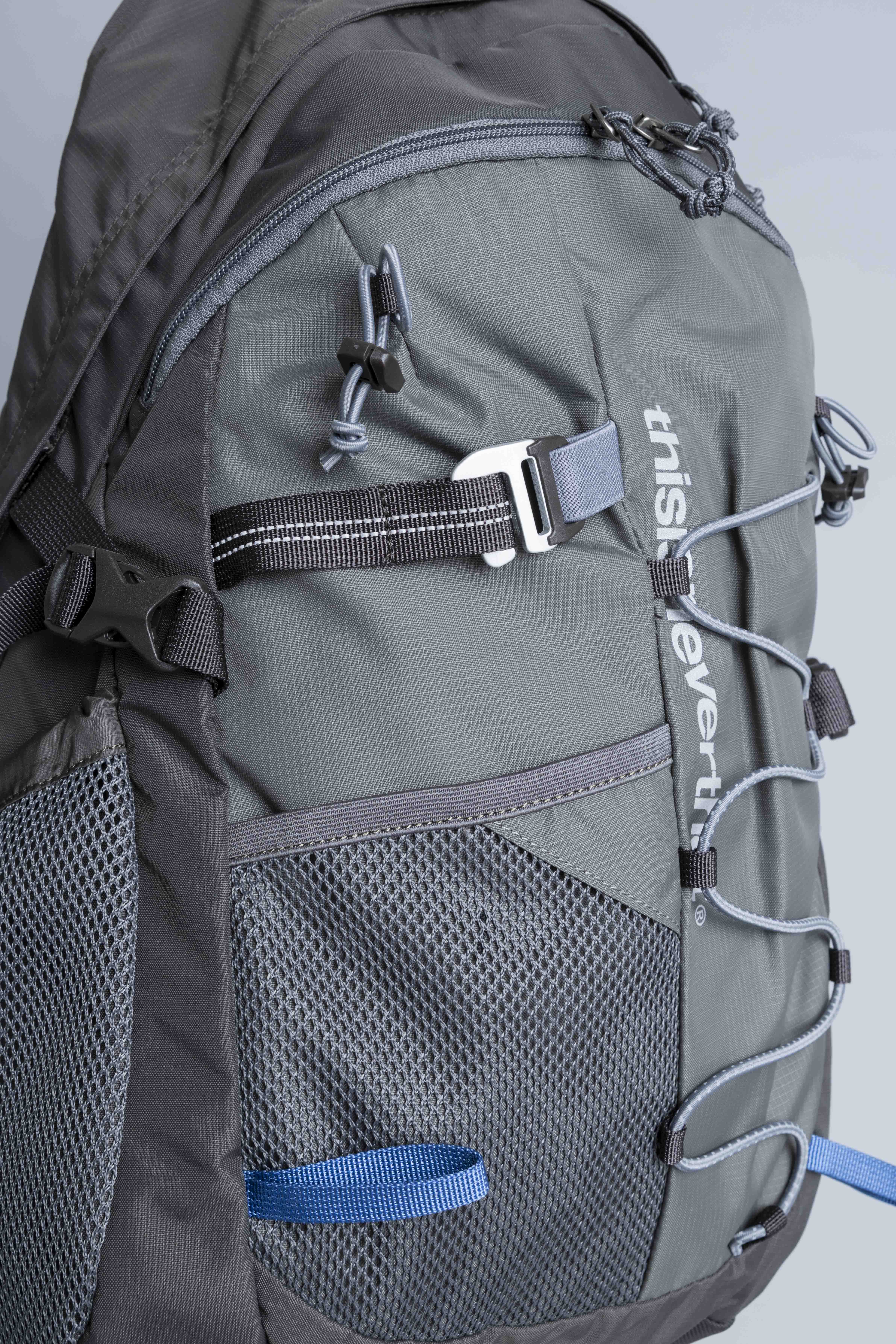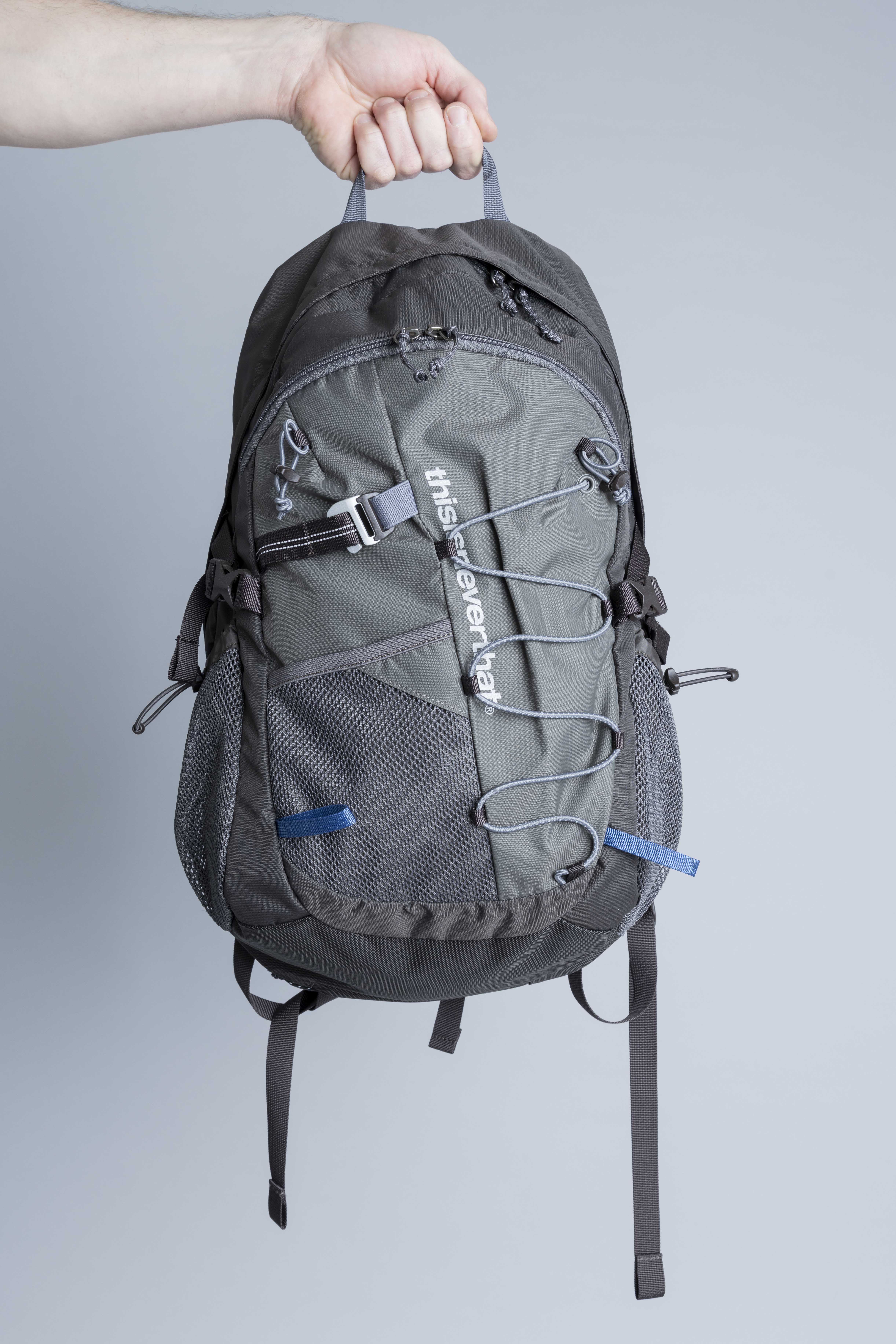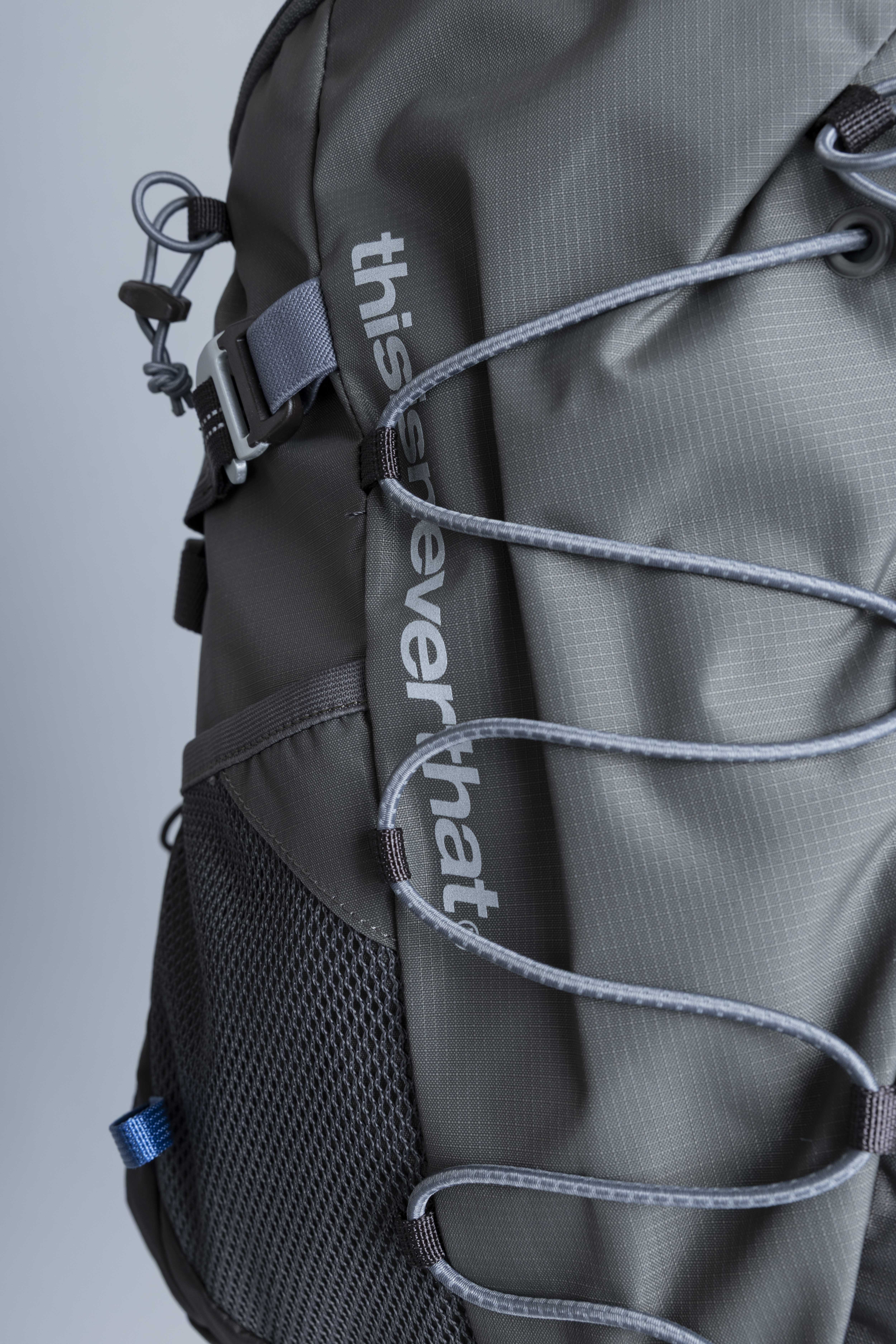 Thisisneverthat SP Logo Field Backpack 28L Charcoal. Crafted from technical materials with a CORDURA® 210D polyester lining, this 28L backpack is built for everyday utility. It features a top handle, front mesh pocket, side mesh storage pockets, a laptop compartment, and a dotted pull tab for easy access. Clean, functional, and ready for daily carry.